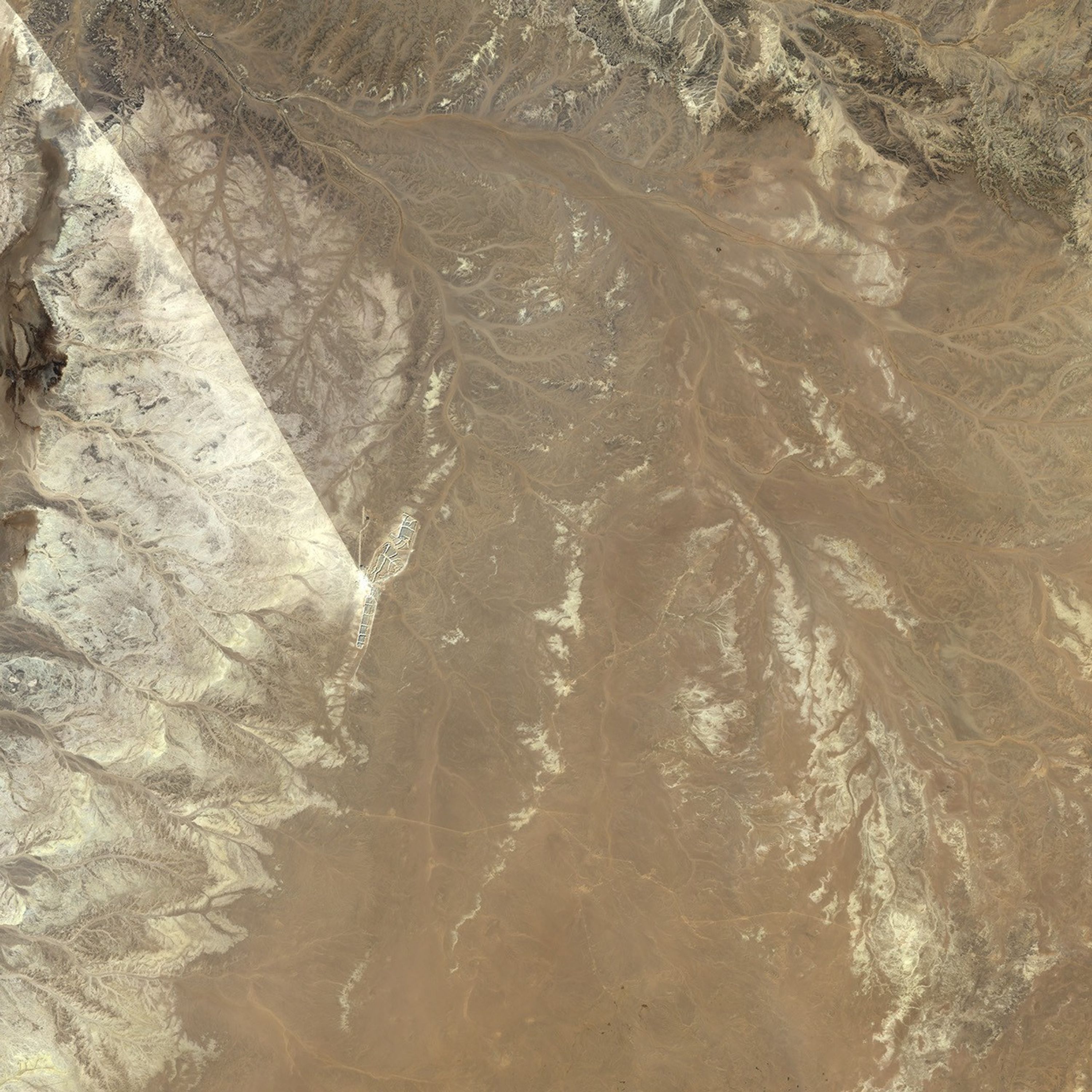 In both images, a conspicuous straight line runs from the center of the mining operations toward the northwest. This is a conveyor belt that connects Bou Craa with El Aaiún, and it can carry 2,000 metric tons of rock per hour. As of 2008, this conveyor belt system was the world’s longest.