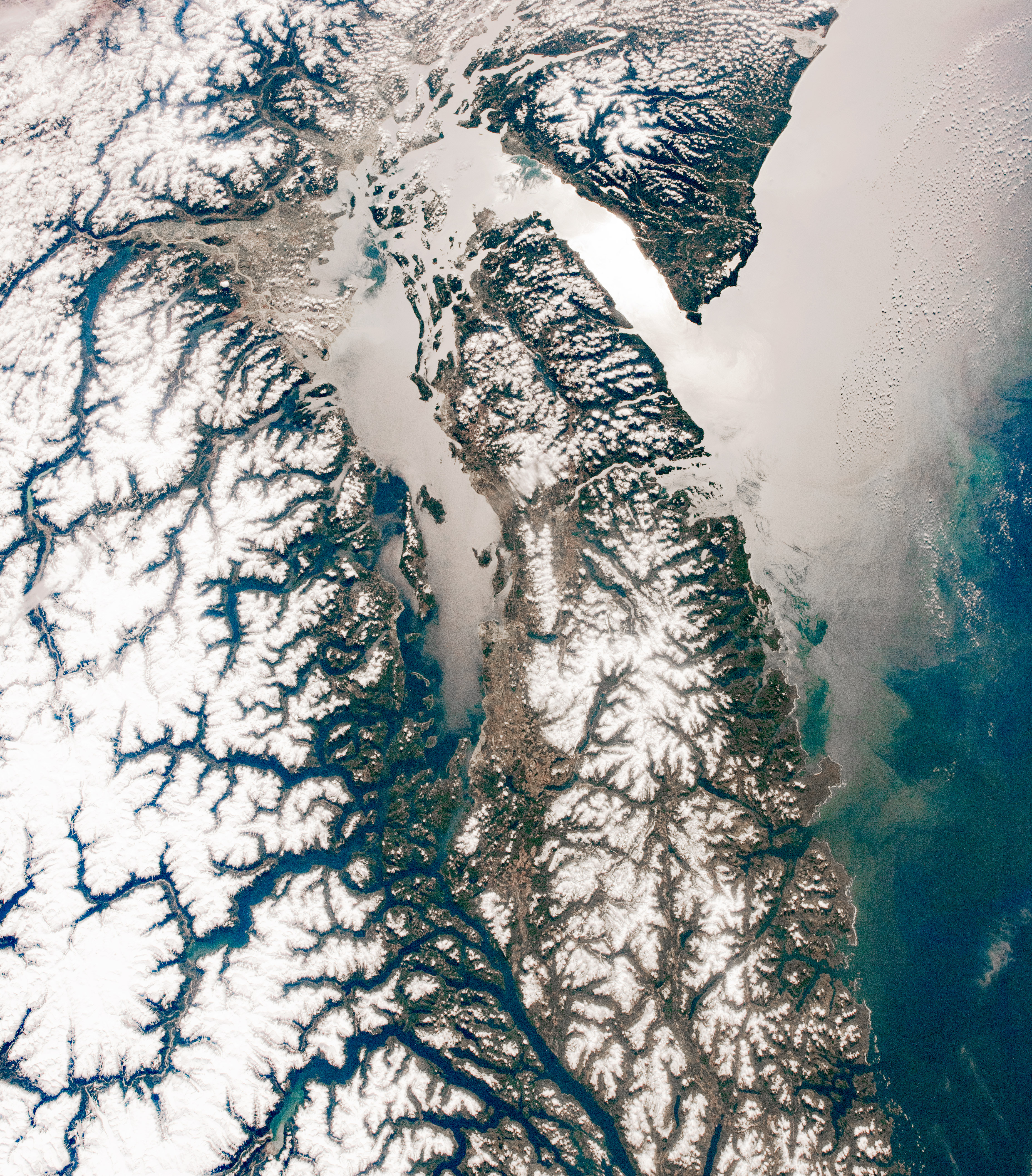 An astronaut aboard the International Space Station shot this springtime photograph of the snow-covered regions of British Columbia (Canada) and the U.S. state of Washington. Both cities of Vancouver, as well as the island, were named for Captain George Vancouver, a British Royal Navy officer best known for his exploration of the northwestern Pacific Coast in the late 1700s. (Note: Vancouver, Washington, is just beyond the top edge of the image.)