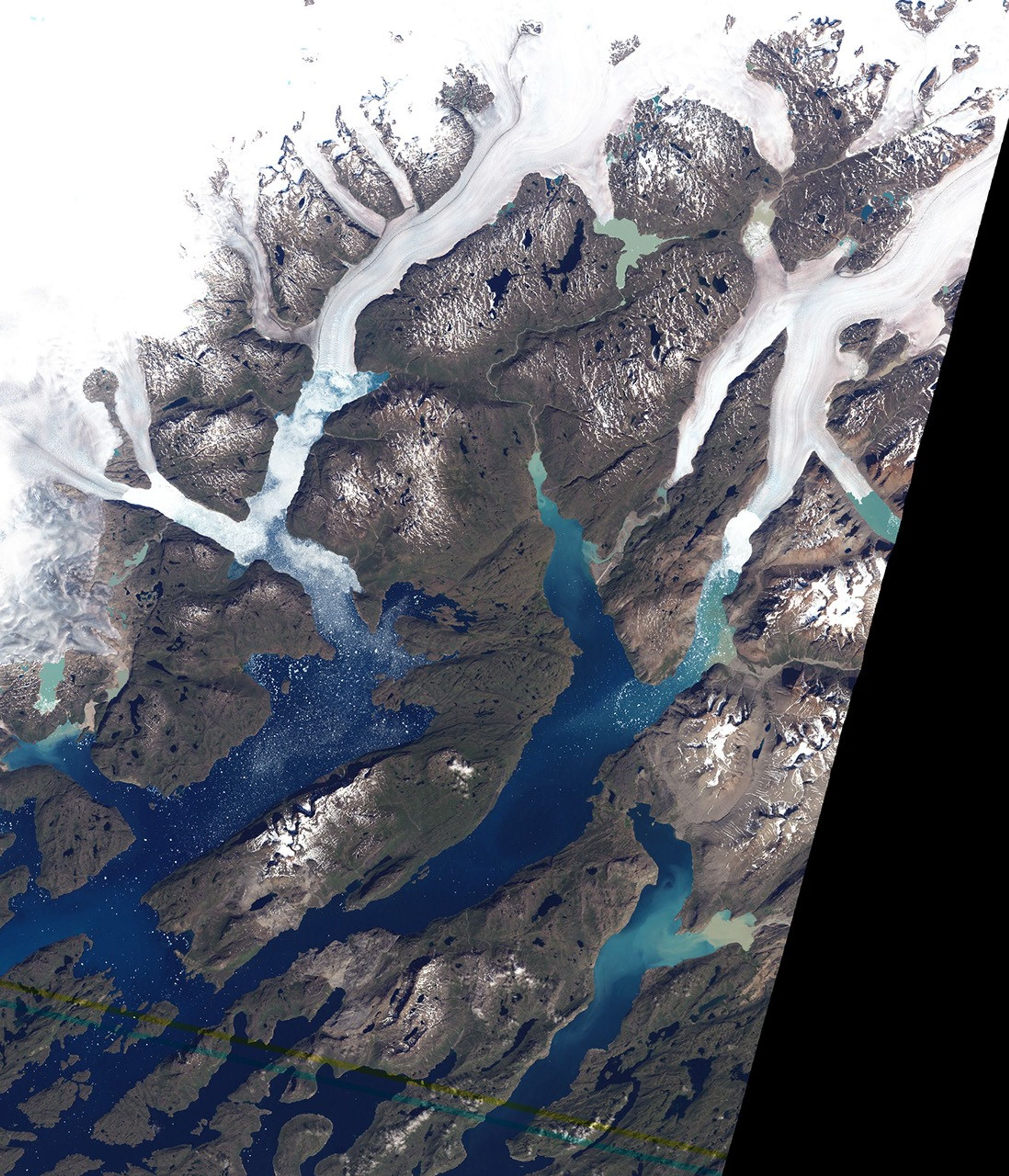 Naming an island that’s 90 percent ice-covered “Greenland” may seem ironic, but the Norse settlers who arrived in AD 985 found a few pockets of vegetation amid the barren rock and snow. Most of these settlements were near the southern tip of Greenland, sheltered deep within narrow fjords. The settlement of Brattahlid was one of Greenland’s wealthiest, founded by Erik the Red himself. Today the town of Qassiarsuk occupies the site of Brattahlid. In this image, Qassiarsuk’s bright green pastures stand out against the tan of bare rocks surrounding the blue water of Eiriksfjord. White icebergs float in the fjord, and snow remains near the surrounding hilltops, even in August.