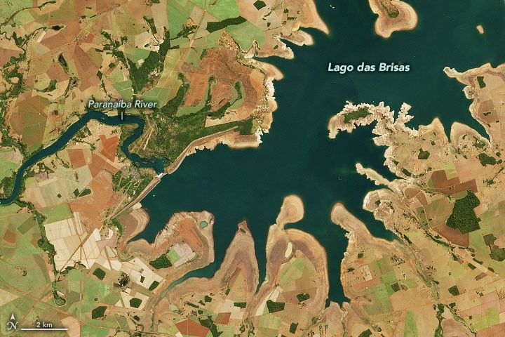 The Operational Land Imager (OLI) on Landsat 8 captured the images above of Lago das Brisas on the Paranaíba River on June 17, 2021 (right) compared to June 12, 2019 (left). Five nearby reservoirs recorded water levels more than two meters below average (1993-2002), according to the Global Reservoir and Lake Monitor.
