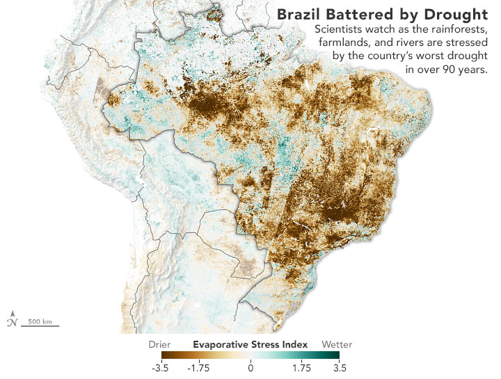 Based on variations in land surface temperatures, the ESI map indicates how the rate of evapotranspiration from May 7 to June 4 compared to normal conditions. Brown areas indicate plants that are stressed due to inadequate moisture, even if their leaves have not yet wilted or turned visibly brown. Much of the stressed vegetation is located in key agricultural states including Minas Gerais, Goiás, Mato Grosso do Sul, São Paulo, and Paraná.