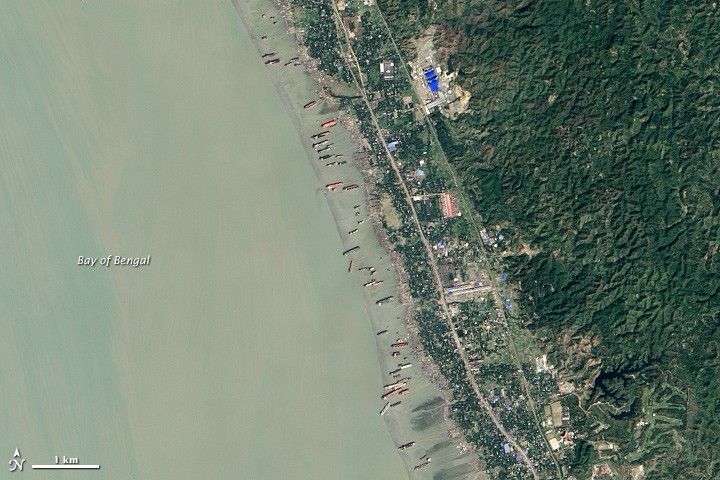 The Operational Land Imager (OLI) on the Landsat 8 satellite acquired these two images of ship-recycling in coastal Bangladesh on December 1, 2013, and February 19, 2014. Turn on the image comparison tool and note how new ships have arrived, others have disappeared, and a few have moved slightly. Several appear to be considerably smaller, likely because disassembly is in progress. Note also the difference in the color of the water near the shore. The lighting changes with the seasons, as does the amount of sediment in the water. Tides and water depth also may have been different at the time of each image.