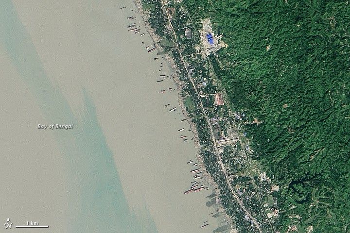 The Operational Land Imager (OLI) on the Landsat 8 satellite acquired these two images of ship-recycling in coastal Bangladesh on December 1, 2013, and February 19, 2014. Turn on the image comparison tool and note how new ships have arrived, others have disappeared, and a few have moved slightly. Several appear to be considerably smaller, likely because disassembly is in progress. Note also the difference in the color of the water near the shore. The lighting changes with the seasons, as does the amount of sediment in the water. Tides and water depth also may have been different at the time of each image.