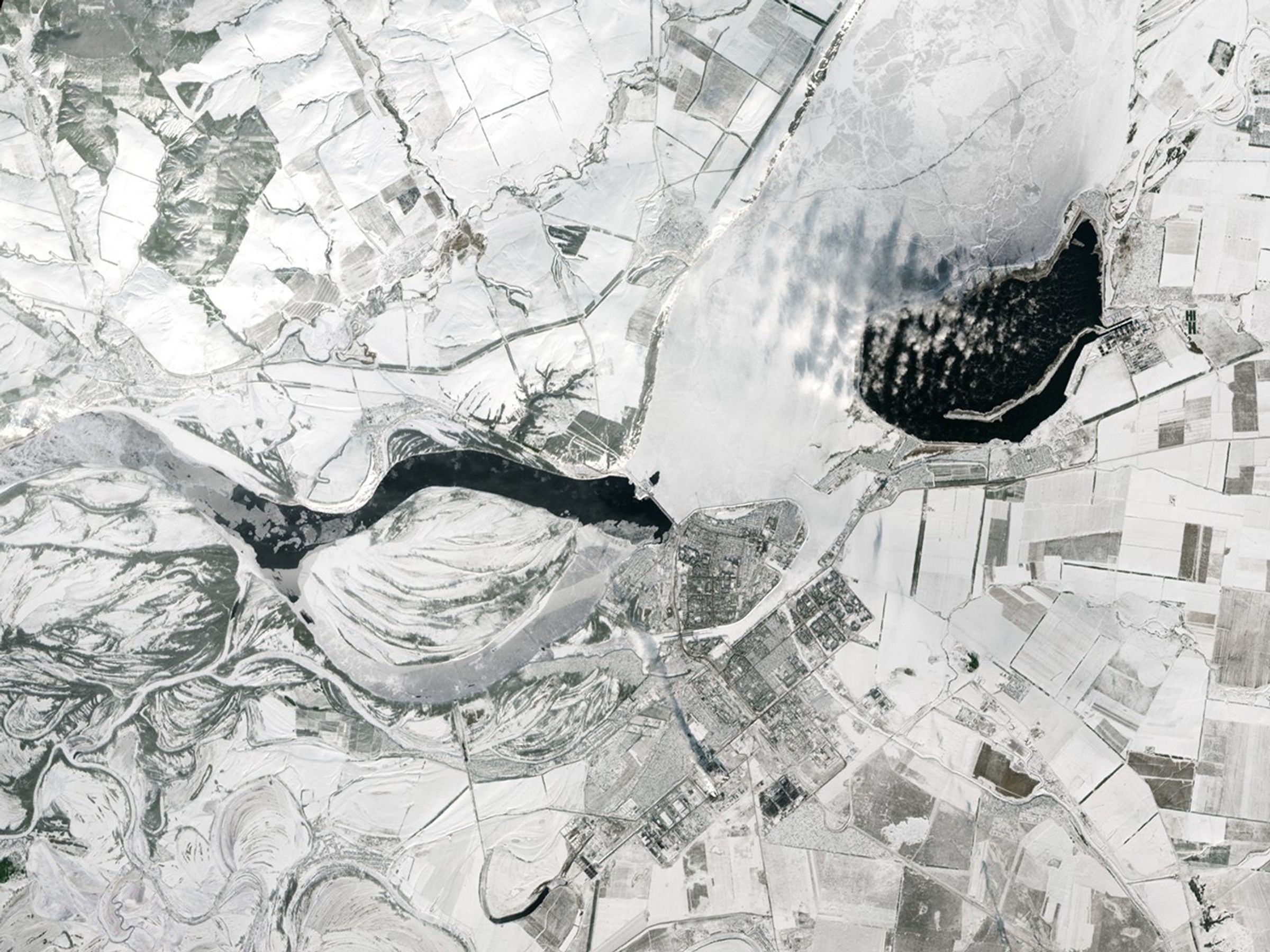 With most of the country located at high northern latitudes, far from the temperature-moderating influence of oceans, much of Russia experiences bitterly cold winters. Wintertime temperatures are usually cold enough to freeze rivers and lakes with ice crusts that are thick enough to walk and even drive on. In this image of the ice-bound Volga River in southern Russia, however, two major ice-free areas contrast sharply with the surrounding wintry landscape. These dark blue areas of open water result from different technologies, but they have a common cause: generating electricity.