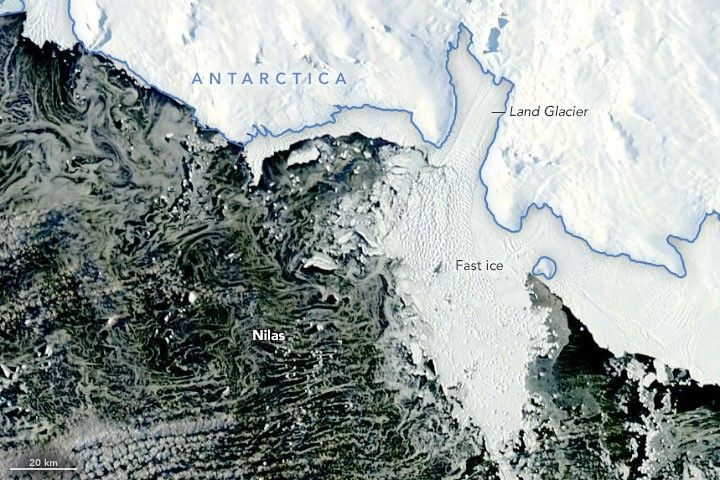 The February image displays a vast expanse of sea ice fastened to the edge of the coastline, and to the Land Glacier’s ice tongue and icebergs. Lowe explained that this “fast ice” often has a symbiotic relationship with glaciers and icebergs. “The glaciers and grounded bergs allow sea ice to accumulate and ‘fast’ in a stable fashion,” he said. “This fast ice then helps anchor those bergs and glaciers as it thickens into old ice over years.”