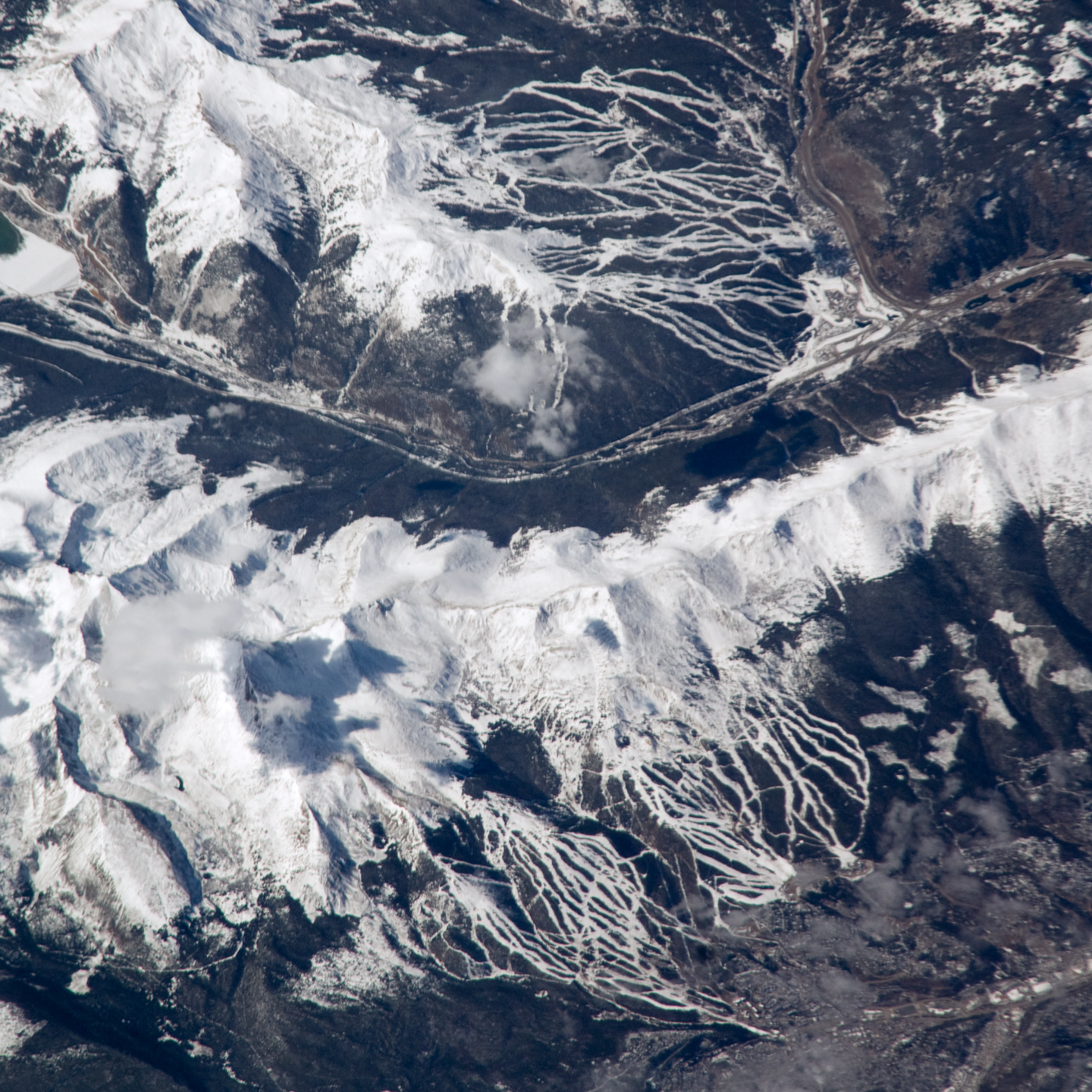 Located in the Colorado Rocky Mountains, Tenmile Range and Copper Mountain are among the state’s meccas for winter sports. In this astronaut photo, the Breckenridge and Copper Mountain ski areas are clearly visible as the snow-covered ski runs stand out from the surrounding darker forest. Tenmile Range has mountain peaks that are named Peak 1 through Peak 10. The Breckenridge ski area uses Peaks 7–10, which range from 3,850 meters (12,631 feet) to 4,150 meters (13,615 feet). Tenmile Creek flows in an unusually straight course through 900-meter (about 3,000-foot) deep Tenmile Canyon, which follows a north-northeast fault line.