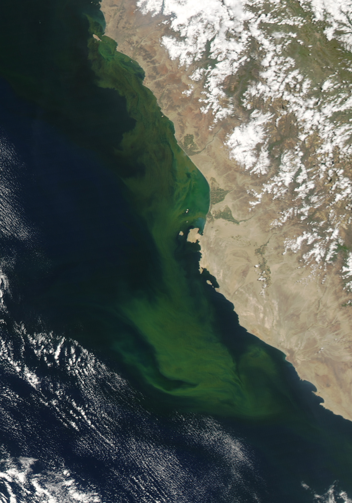 It is hard to identify exactly what is causing this bright water patch off Peru using only satellite data. While scientists continue to refine their algorithms in hopes of one day being able to accurately diagnose such events from space-based remote sensors, today the only way scientists can be sure is to collect water samples from the event while it is ongoing.