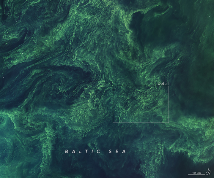 Identification of the type of phytoplankton within this bloom cannot be determined based on these satellite images alone. But experts from the Swedish Meteorological and Hydrological Institute (SMHI) reported that surface waters that day contained cyanobacteria—an ancient type of marine bacteria that captures and stores solar energy through photosynthesis. Suspended sediment and pollen can also contribute to the yellow-green color in parts of the sea, but the SMHI maps of cyanobacteria match the locations shown in these images.