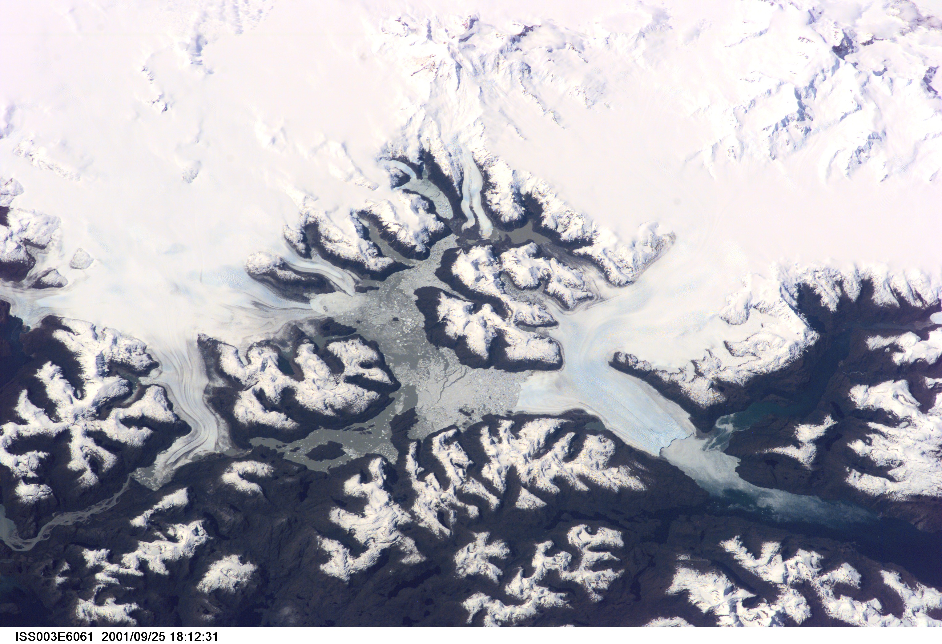 The Expedition 3 crew of the International Space Station caught a rare glimpse of the massive ice fields and glaciers of Patagonia early in the afternoon on September 25, 2001. This part of the South American coast sees frequent storms and is often obscured from view by cloud cover.