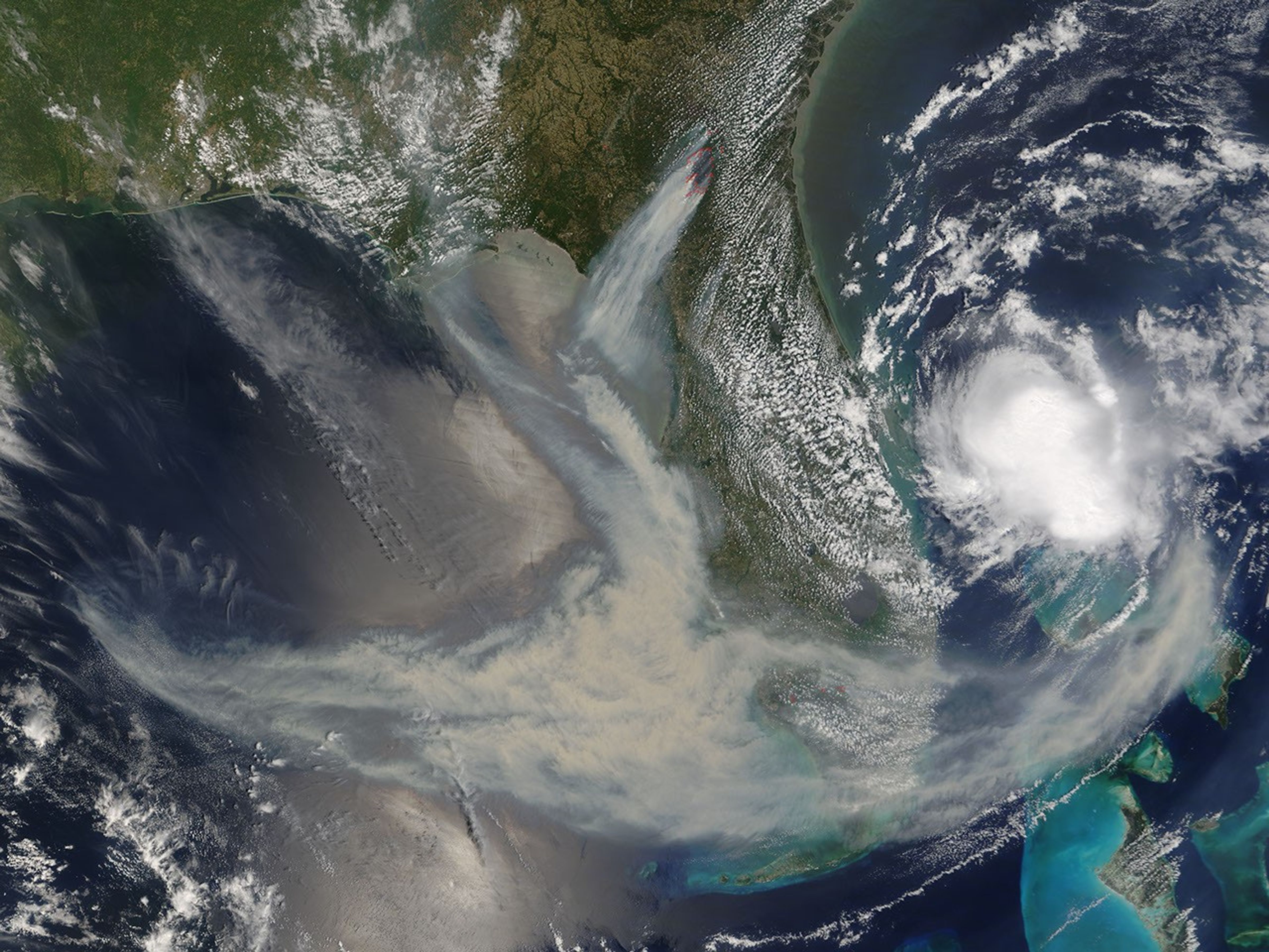 Subtropical Storm Andrea apparently did little to quench numerous large wildfires burning in the U.S. Southeast in early May 2007. On May 11, 2007, when the Moderate Resolution Imaging Spectroradiometer (MODIS) on NASA’s Terra satellite captured this image, the remnants of the storm had dwindled to a small ball of clouds in the Atlantic Ocean, and huge plumes of smoke snaked across Georgia, Florida, and the Gulf of Mexico. Areas where MODIS detected actively burning fires are outlined in red.