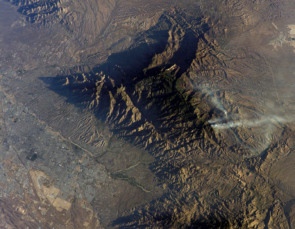 This image of the Bullock Fire was taken by the crew of the International Space Station using a digital camera on May 23, 2002, two days after the fire began. By May 25, fighting the fire was listed as the top national priority. The mountainous region of the Coronado National Forest, northeast of Tucson, Arizona, is highlighted by the low sun angle when the photograph was taken. Around 30,560 acres were consumed by the blaze (which was 85% contained by June 3) but it is still considered dangerous.