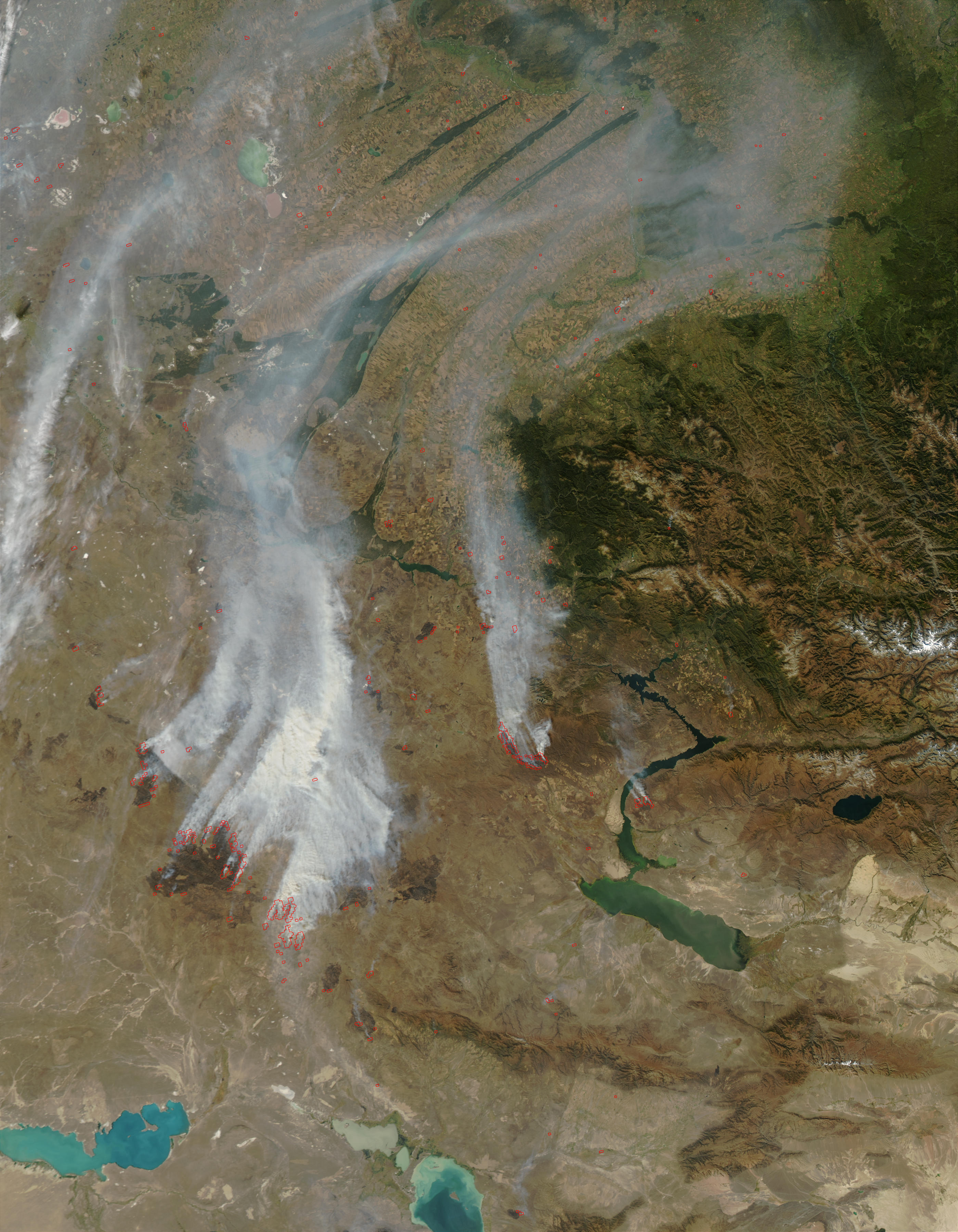 This true-color image from the Moderate Resolution Imaging Spectroradiometer (MODIS) on the Aqua satellite shows several large fires burning in the steppes of Kazakhstan (bottom and center) as well as smaller, scattered agricultural fires (top). All active fires are marked with red dots (or outlines in the high-resolution images). The image was acquired on September 21, 2002.