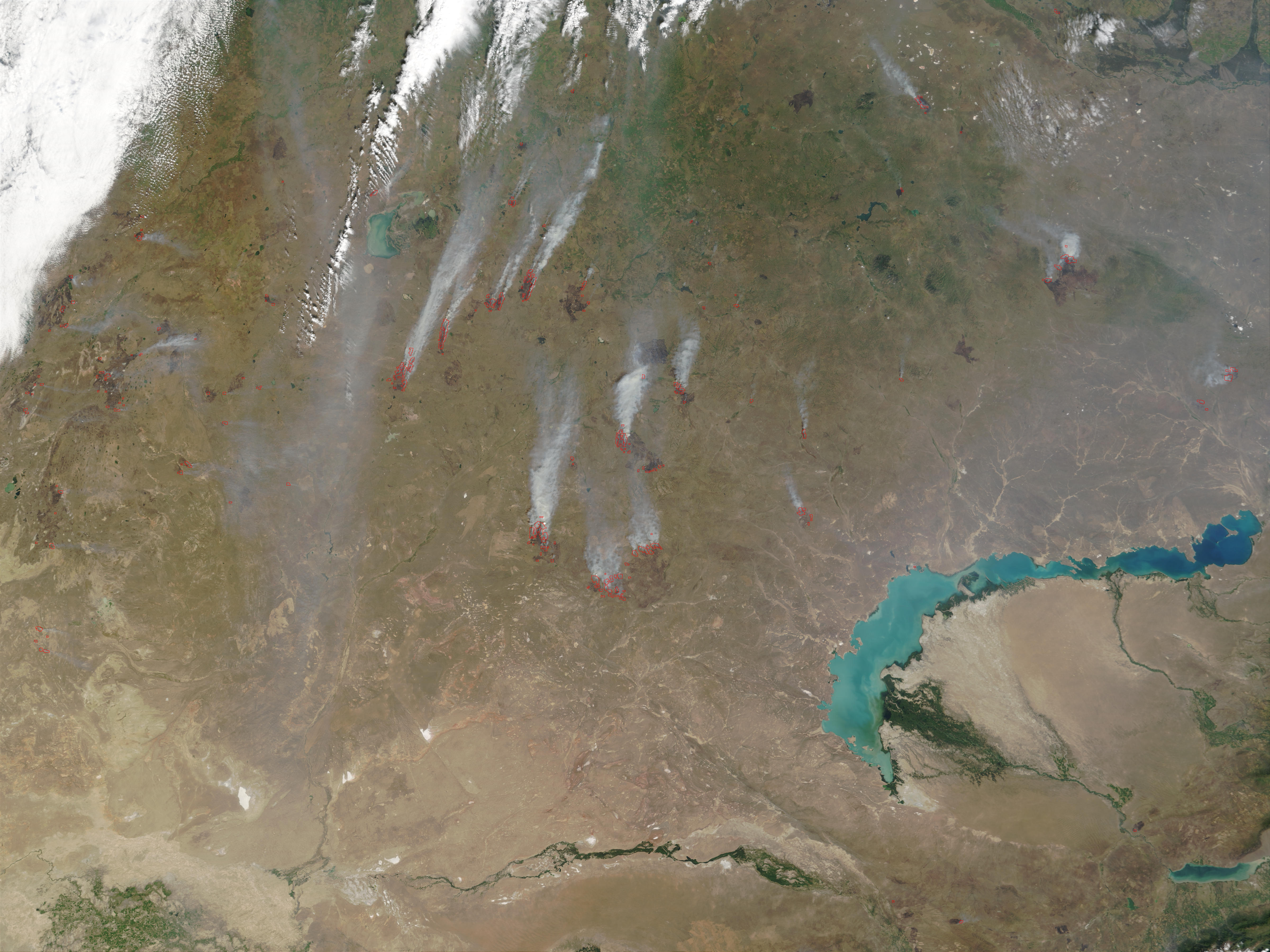 On August 10, 2002, the Moderate Resolution Imaging Spectroradiometer (MODIS) on the Terra satellite captured this true-color image of Kazakhstan and numerous fires (red dots) burning there. The patchwork of small rectangles that dominates the northern part of the image shows plots of farm or ranch land, and the small scattered fires are likely for agricultural purposes. Some of the larger blazes to the south may be grassland fires, or agricultural burns that got out of control.