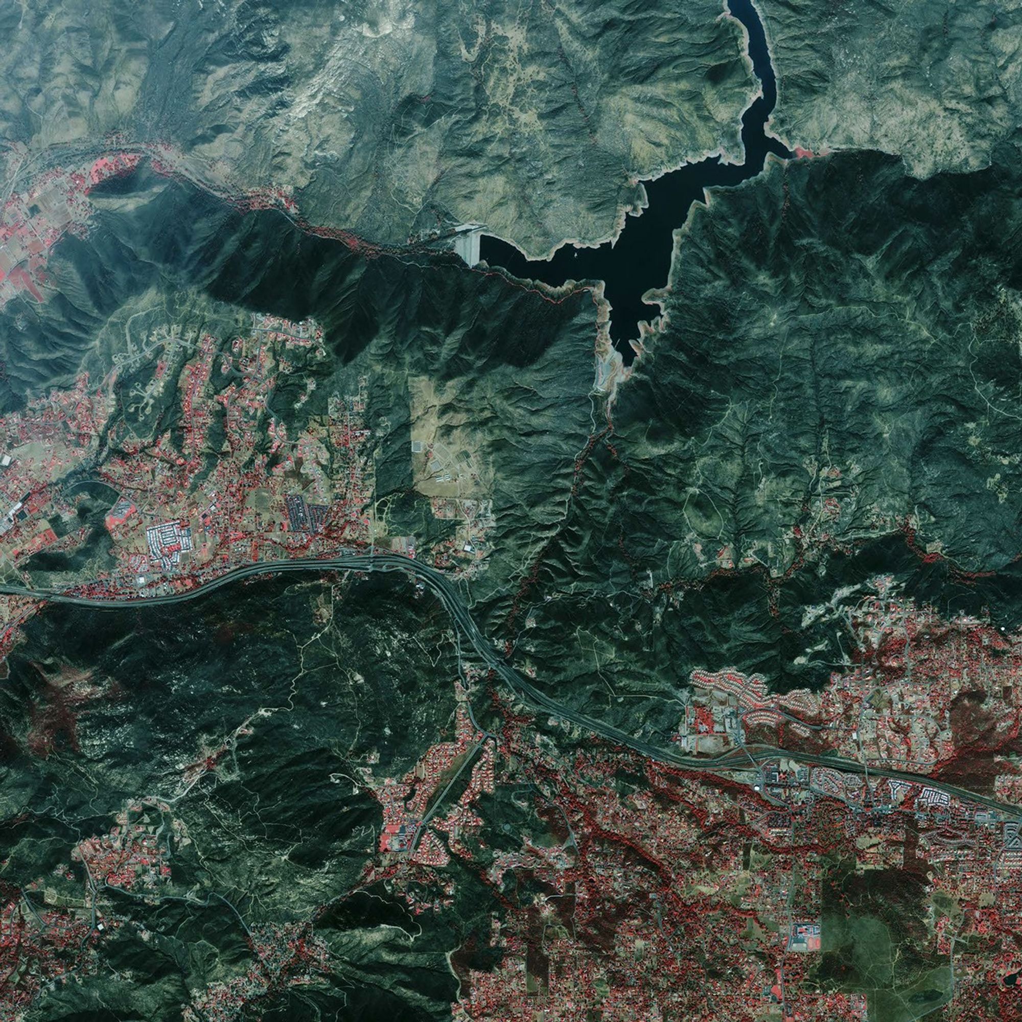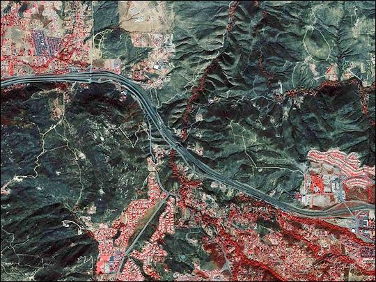 The flames of the Cedar Fire engulfed the mountain city of Alpine, in Southern California. The fire consumed the trees and brush surrounding the city, and in some places, entire neighborhoods burned. The extent of the fire is clear in this Ikonos image taken on November 8, 2003. The false-color image (combining near infrared, red, and green wavelengths of light), shows blackened land completely surrounding Alpine’s neighborhoods. Living vegetation is red, while burned areas appear blue-black. The only areas which are not burned are landscaped patches around homes or businesses.