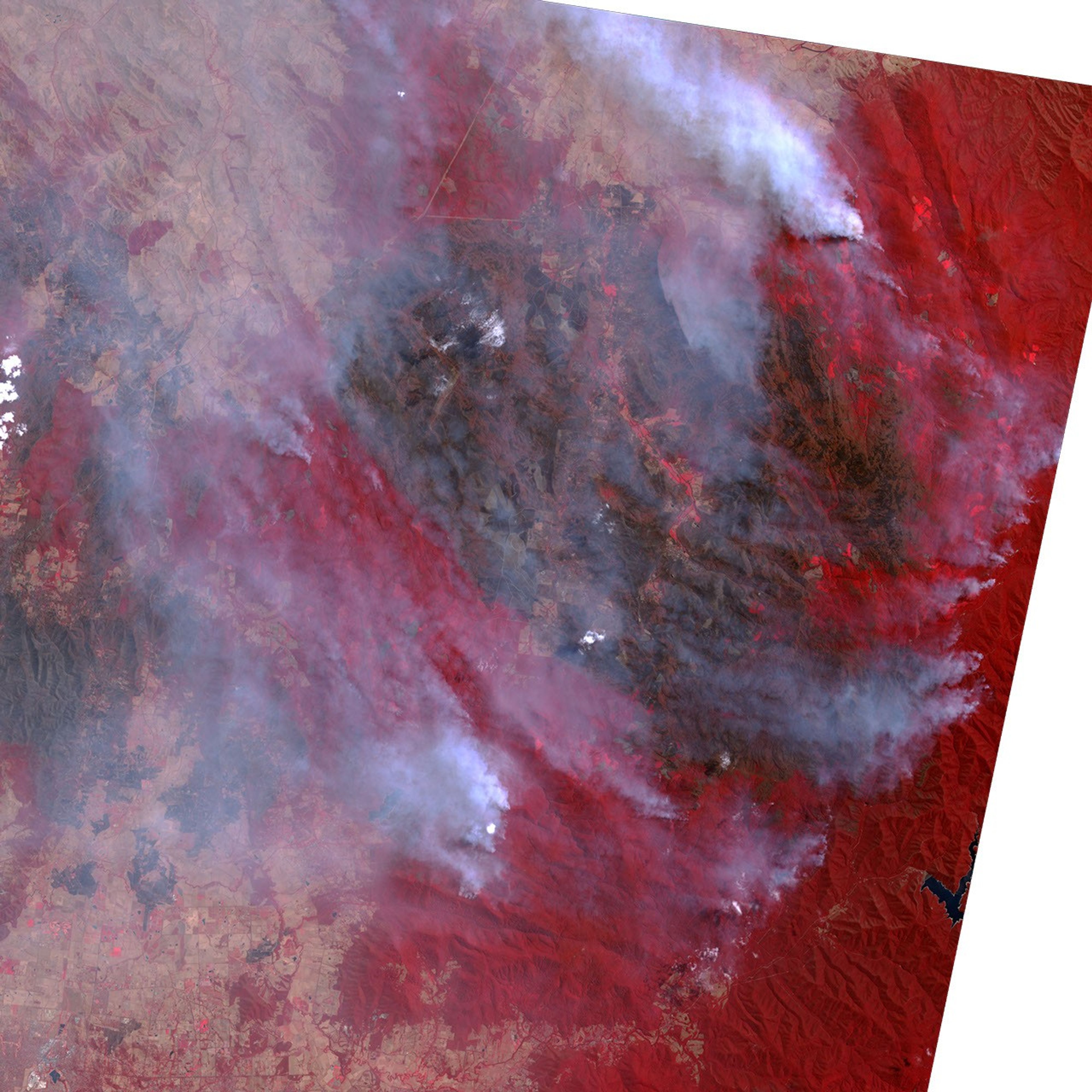 The image uses a combination of visible and near-infrared wavelengths of light to make the smoke more transparent and to highlight burned areas. Unburned vegetation is red, while burned areas are charcoal. The top image is a wide-area view of much of the Killmore East-Murrindindi Complex North Fire. The lower image shows a close-up around the small town of Marysville. The huge fire sprawls across the Cathedral Range Mountains on either side of the Maroondah Highway. Marysville sits near the center of the immense burn scar. At least 39 people died in Marysville, and disaster response crews were still in the field as of February 18, according to news reports.