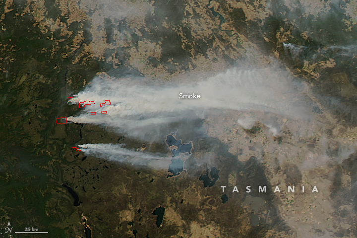 Several days earlier, the Moderate Resolution Imaging Spectroradiometer (MODIS) on NASA’s Aqua satellite captured an image (below) showing several fires burning through forested areas southeast of Cradle Mountain. Red outlines indicate hot spots where MODIS detected the unusually warm surface temperatures associated with the fires.