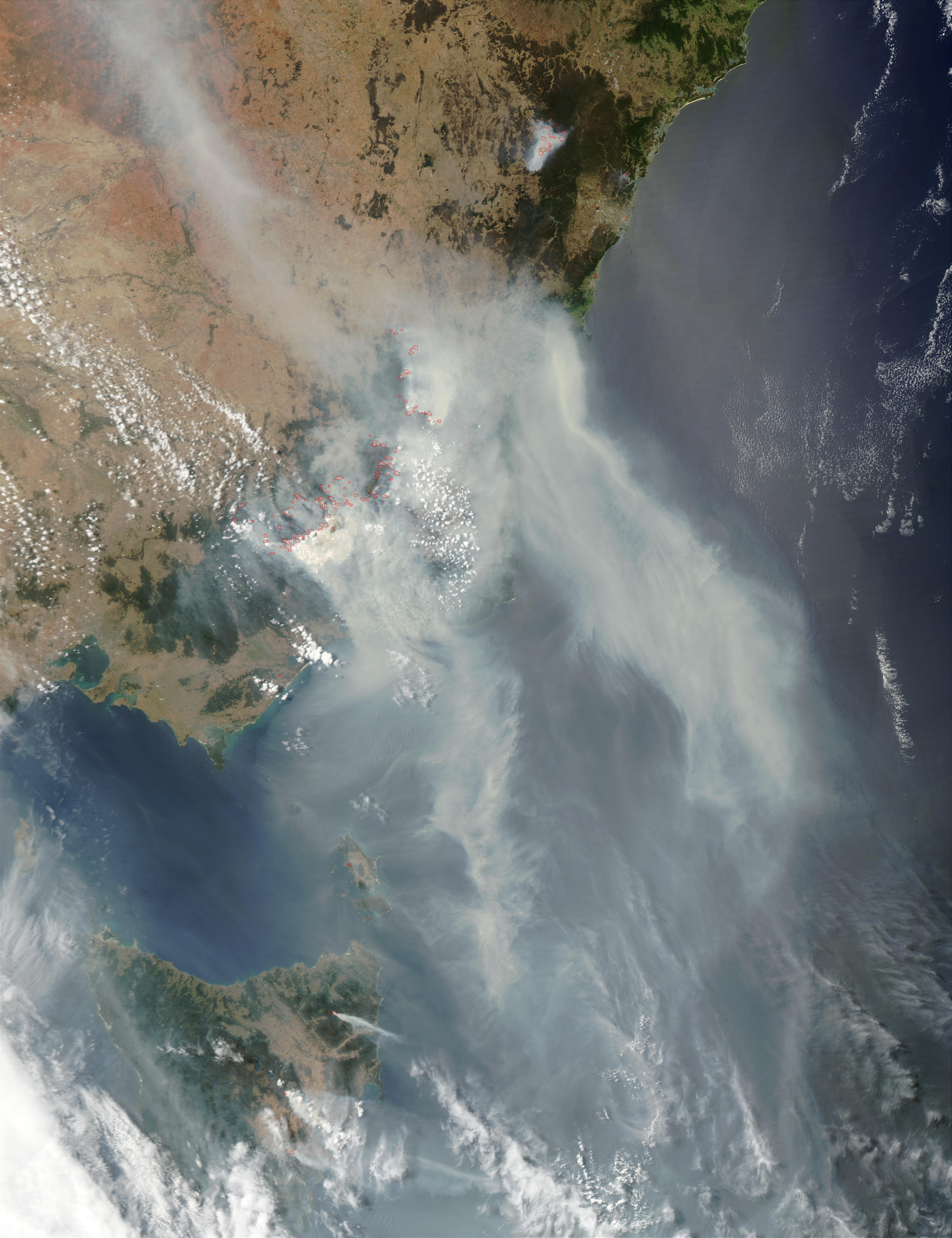 Bushfires rage on in southeast Australia on January 25, 2003. Smoke is covering the southeastern corner of the continent and reaching out over the Pacific Ocean in this true-color Moderate Resolution Imaging Spectroradiometer (MODIS) from the Aqua satellite. At top center, a large cluster of fires is burning northwest of Sydney, whose metropolitan area makes a mushroom-shaped clearing in the forests. At the bottom left of the image, several fires (red dots) have been detected on Tasmania, contributing to the regional haze.