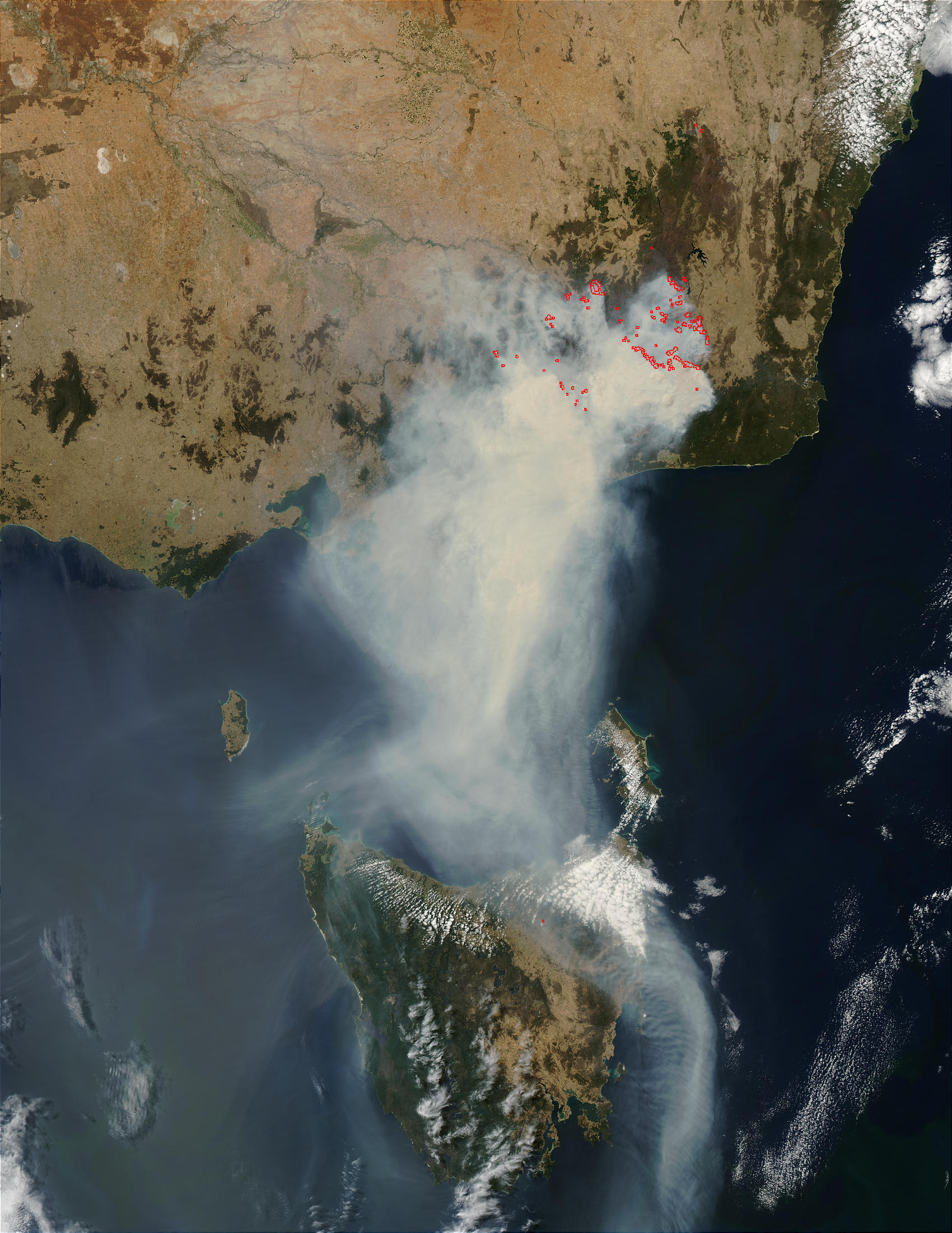 The smoke plume from fires in southeast Australia was 300 kilometers (186 miles) wide in places and more than 877 kilometers (545 miles) long on February 4, 2003. Fires have been burning out of control in the region for several weeks, even invading urban areas such as Canberra, the nation’s capital. This true-color Moderate Resolution Imaging Spectroradiometer (MODIS) image was captured by the Aqua satellite.