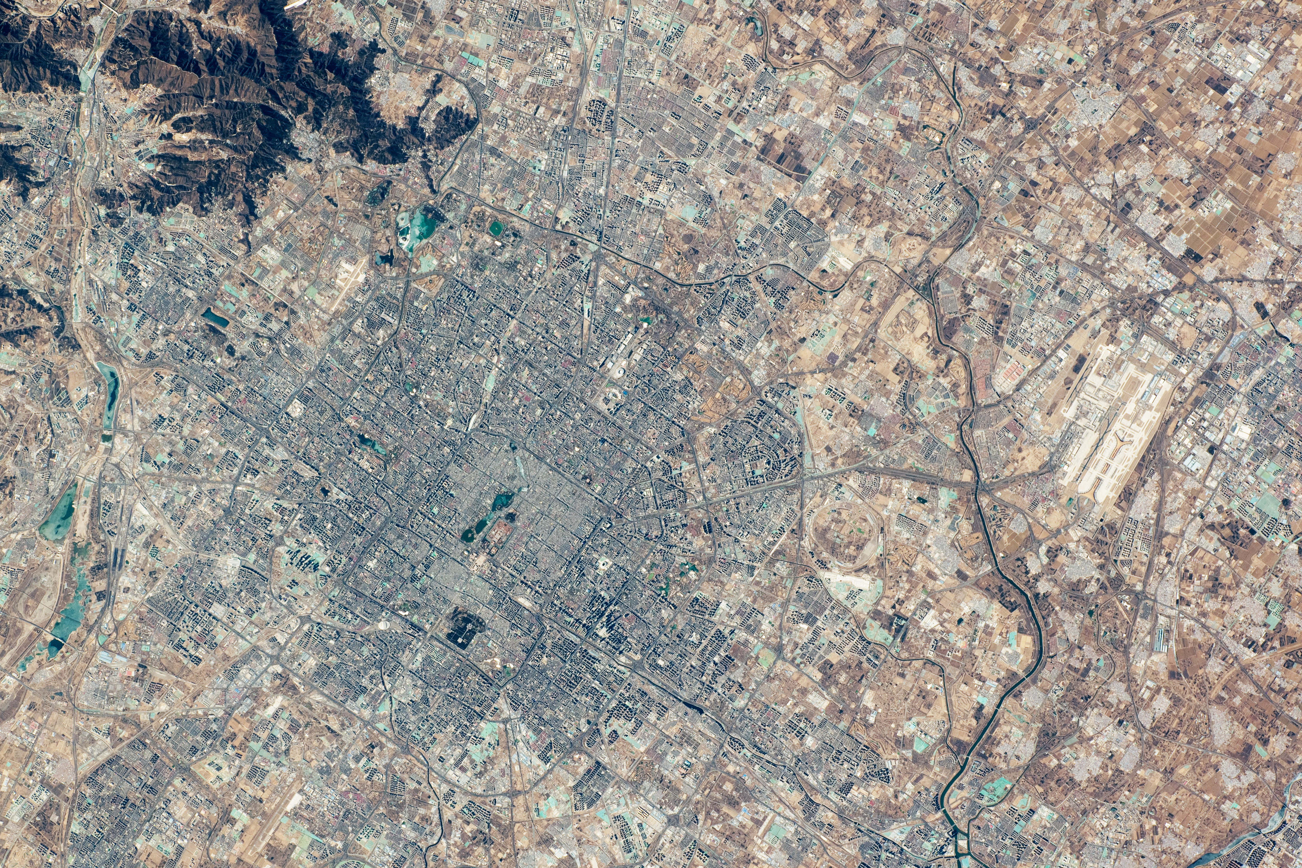 Patterns of transportation networks are a common feature in astronaut images. Beijing’s road system is known for its eight concentric rings surrounding the urban area. Six of these ring roads can be identified in the image. The 2nd Ring Road follows the ancient moat around the old central zone, and the 5th Ring Road encloses the densely built-up neighborhoods.