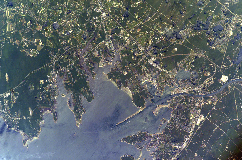 The modern Buzzards Bay is approximately 45 kilometers (28 miles) long by 12 kilometers (8 miles) wide and is a popular destination for fishing, boating, and tourism. The Cape Cod Canal allows for passage between Buzzards Bay and Cape Cod Bay to the northeast (not visible); the wakes of numerous pleasure craft appear along the length of the Canal. The combination of shallow depth, tidal action and surface waves promotes mixing of the estuarine waters leading to a productive aquatic ecosystem. The dynamic nature of the Bay’s waters are visible in this astronaut photograph as surface wave reflectance patterns around Stoney Point Dike and in the kettle lakes. Like many estuaries, however, increasing development and land-use change by the surrounding communities are accompanied by nutrient runoff leading to eutrophication (an increase in nutrient levels leading to oxygen depletion) in the smaller embayments. Decreases in eelgrass, scallops, and herring have also been noted, but direct cause-and-effect relationships are not clear. Coordinated management efforts in Buzzards Bay have helped to decrease shellfish closures, conserve habitat for sea birds, and preserve open space.