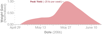 “During the peak of the nectar flow, a good, strong colony can gain 10 to 20 pounds in one day,” he says. “In Maryland, that goes on for a few weeks in late spring, and then, suddenly, it’s over.” For the remainder of the year, the weight of the hive dwindles as bees sustain themselves on the honey and pollen they have stockpiled during their three-to-four-week feeding frenzy. It was through this annual yo-yoing of weight gain and loss that Esaias’ bees began to tell him their story of climate change.