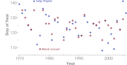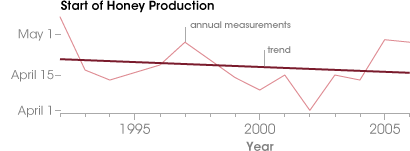 Esaias scoured scientific books and papers for observations that could corroborate the story his bees were telling about how flowering times were changing in Maryland. He discovered that for several decades, Smithsonian botanist Stan Shetler had been keeping tracks of flowering dates for trees in and around Washington, D.C., based on calls from city residents that their backyard trees—including tulip poplar and black locust, two of the most important nectar producers in the state—were in bloom. Those records showed an advance in flowering (earlier blooming) beginning as far back as 1970.