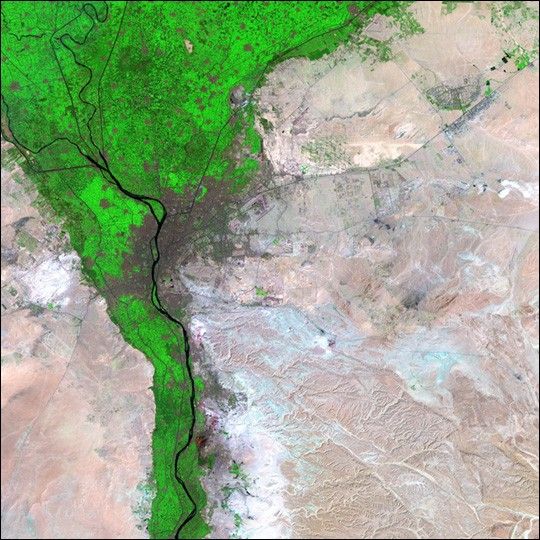 Steeped in a 5,000-year history that encompasses Egyptian Pharaohs, ancient wonders, Roman Emperors, and bloody conquests, Cairo, Egypt, sits on the Nile River about a hundred miles south of the Mediterranean Sea. Cairo boasts a population of 16 million and covers an area of 214 square kilometers (82.6 square miles). The city appears as a large dark brown and purple mass in the center of the image. The bright green regions surrounding the city are farms along the fertile banks of the Nile, which have provided sustenance for residents of the region since before recorded history. Just outside this green swath is the arid and forbidding Sahara Desert.