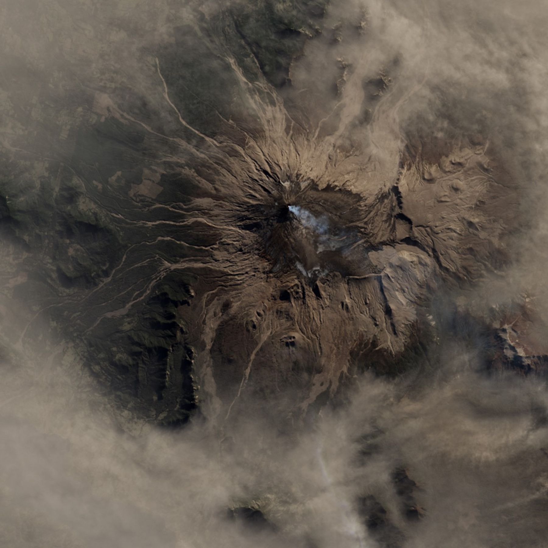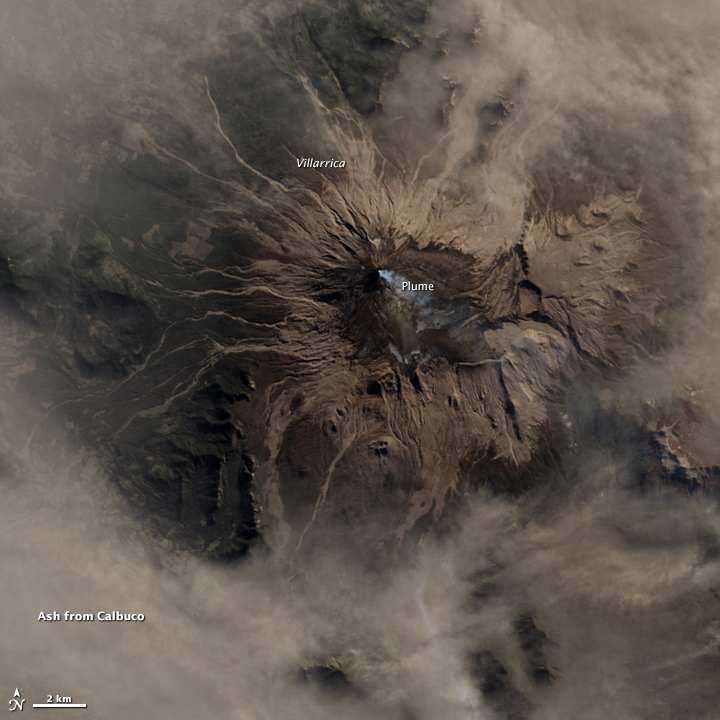 Other ejecta from Calbuco moved north toward Villarrica—another volcano in Chile that has seen renewed activity in 2015. On April 27, 2015, the Operational Land Imager (OLI) on Landsat 8 acquired the image below, which shows a small steam or ash plume rising from Villarrica. But the brown, airborne material surrounding the volcano, and presumably some of the brown material on its flanks, is from Calbuco, located about 220 kilometers (140 miles) to the south.