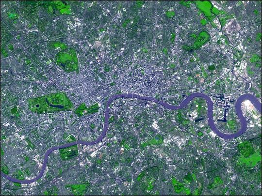 Calcutta is the world’s leading producer of a natural fiber called jute, which can be used in everything from clothing to carpet. The production factories are located along the river banks along with several power plants; it may be a combination of emissions from both these sources that is creating the slight haze visible from the north end of the city up to the top of the image. In the upper part of the image, numerous dark “squiggles” are in fact lakes, perhaps oxbow lakes, which are formed when a part of a stream or river is cut off from the main channel by sedimentation and changes in the direction of the current. That they are lakes, and not free-flowing bodies of water, is supported by their dark color, which in this false-color image suggests that they are calm and clear, rather than sediment-laden like the Hooghly River and the other branches of the Ganges that can be seen at lower right.