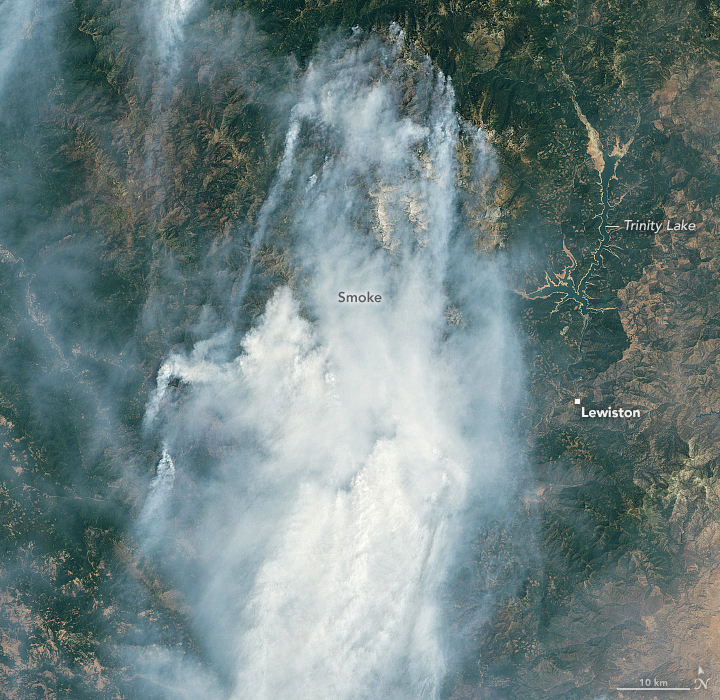 On August 19, 2021, the Visible Infrared Imaging Radiometer Suite (VIIRS) on the NOAA-NASA Suomi NPP satellite acquired a natural-color image (above) of fires raging in California. While smoke has often blown west in recent weeks, shifting winds have begun to darken skies in northern and central California, triggering air quality alerts in Sacramento and San Francisco.