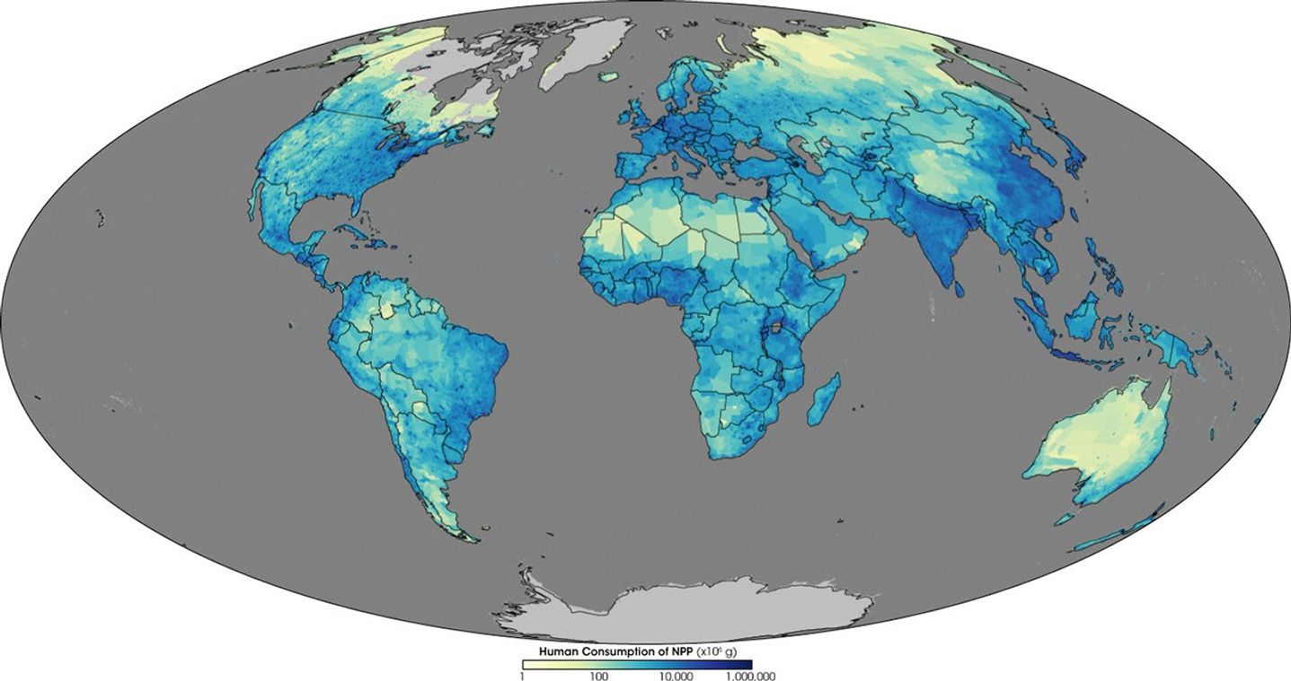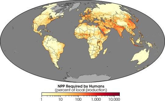 Marc Imhoff, a biophysical scientist with NASA, has been exploring these questions with colleagues from the University of Maryland’s Earth System Science Interdisciplinary Center, the World Wildlife Fund, and the International Food Policy Research Institute for six years. He said, “Our primary motivation has been to find out where we stand relative to our survival on the planet, and what our needs are compared to the capability of the biosphere to sustain them. In fact, it goes beyond just need; it includes our different lifestyles—our appetites.” To build some answers, Imhoff set about measuring global plant productivity, calculating human consumption levels on a cultural level, and then comparing what he learned. His findings remind us that we all rely on the same finite Earth.