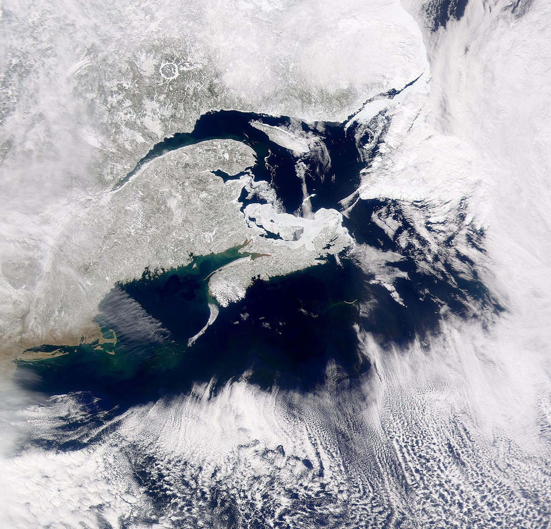 On the Northern Hemisphere’s first day of spring, 2001, Canada’s Maritime Provinces remain covered in snow. This true-color image from the Sea-viewing Wide Field-of-view Sensor (SeaWiFS) was taken on March 20, 2001. Near the top of the image the white circle is the Manicouagan impact crater, formed 210 million years ago. The arc of open water to the south (below) is the St. Lawrence River, which widens into the Gulf of St. Lawrence. To the east, on the other side of the Gulf (and partially obscured by clouds), is the Island of Newfoundland. South of the Gulf is Nova Scotia, separated from New Brunswick by the Bay of Fundy, scene of the highest tides in the world [up to 16 meters (52 feet)]. The high tides stir up sediment in the Bay, which is green and brown. Further south along the coast of mainland North America, snow-free Cape Cod and Long Island appear prominently. The clouds bordering the southern edge of the image occur along the edge of the relatively warm water of the Gulf Stream.