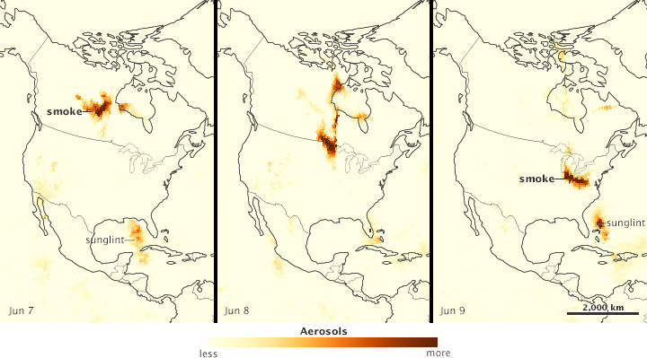 The series of images below shows the plume’s movement. They wereacquired by the Ozone Mapping Profiler Suite (OMPS) on the Suomi NPP satellite. Smoke from fires burning in Alberta, Canada, is visible on June 7 over Canada’s Saskatchewan and Manitoba provinces (left). The smoke entered the United States over Minnesota on June 8 (middle), and then moved over the Midwest on June 9 (right).