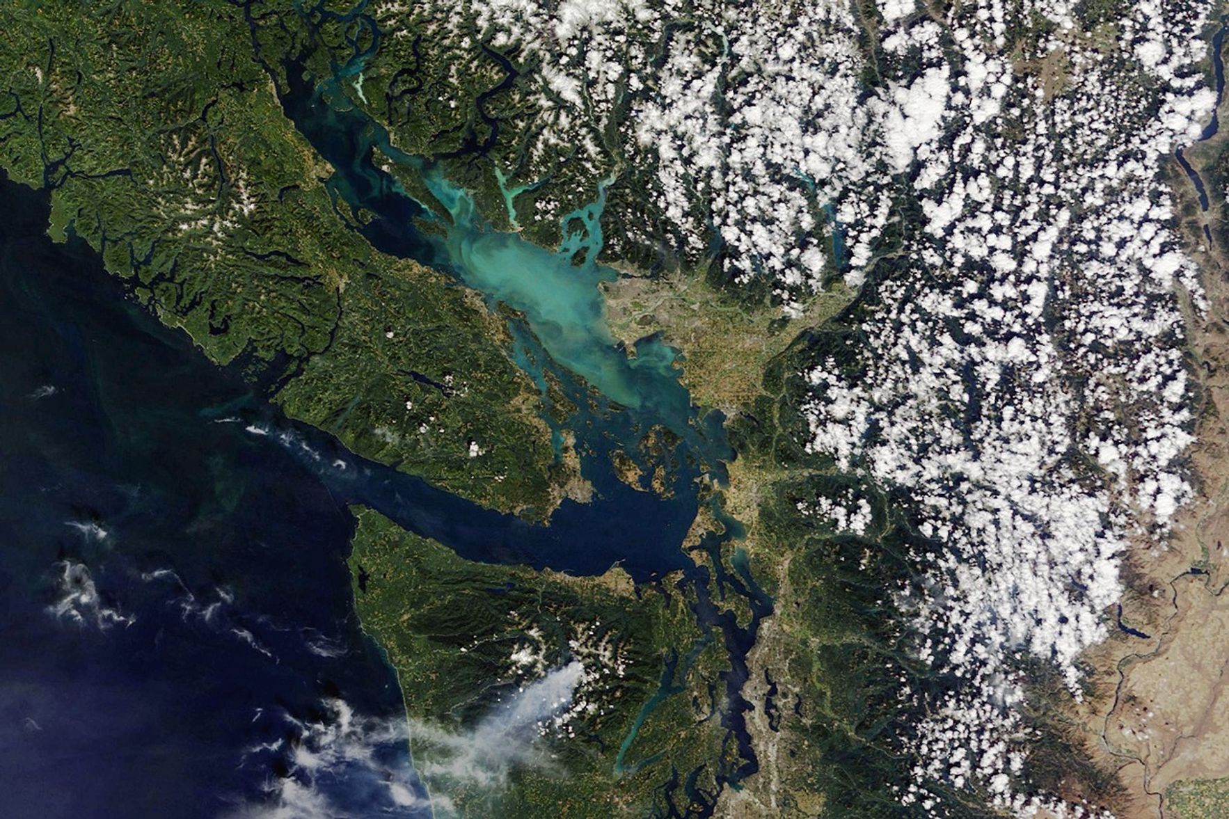 For reasons that scientists are still trying to figure out, the Strait of Georgia and nearby inlets have been teeming with coccolithophores, a harmless type of phytoplankton, or floating plant-like organism. Coccolithophores have chalky, scale-like shells made of calcium carbonate. The milky-white color of those shells can brighten and discolor otherwise blue waters when the plankton explode in such massive blooms. Marine scientists believe some harmless species of diatoms are also in the mix, adding to the green color.