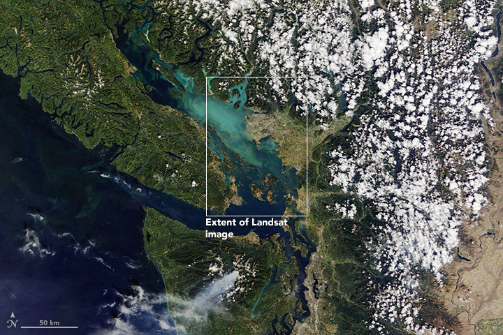 “No one knows why this bloom is so widespread and intense,” said Debby Ianson of Fisheries and Oceans Canada. She suspects that a seed population from the west may have been carried (by advection) into the Strait; coccolithophores are more common in the Alaskan Gyre and other offshore Pacific waters. The seeds that found their way from the continental shelf into the Strait would have encountered relatively low pH waters that are not necessarily good for phytoplankton growth.