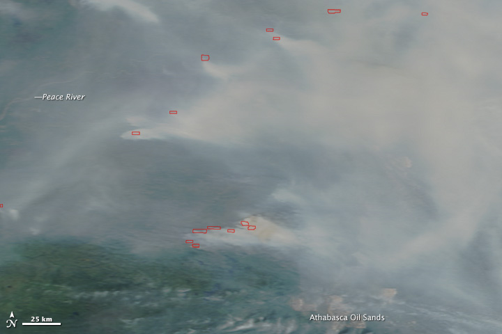 On June 29, 2015, the Moderate Resolution Imaging Spectroradiometer (MODIS) on NASA’s Terra satellite captured this image of smoke from hundreds of wildfires in western Canada. Actively burning areas, detected by the thermal bands on MODIS, are outlined in red, while forests appear dark green. The image below shows shows a closer view of smoke and fires burning in northern Alberta near the Athabasca oil sands. While hundreds of fires are burning throughout Canada, some of the fires producing the most smoke are clustered in this area.