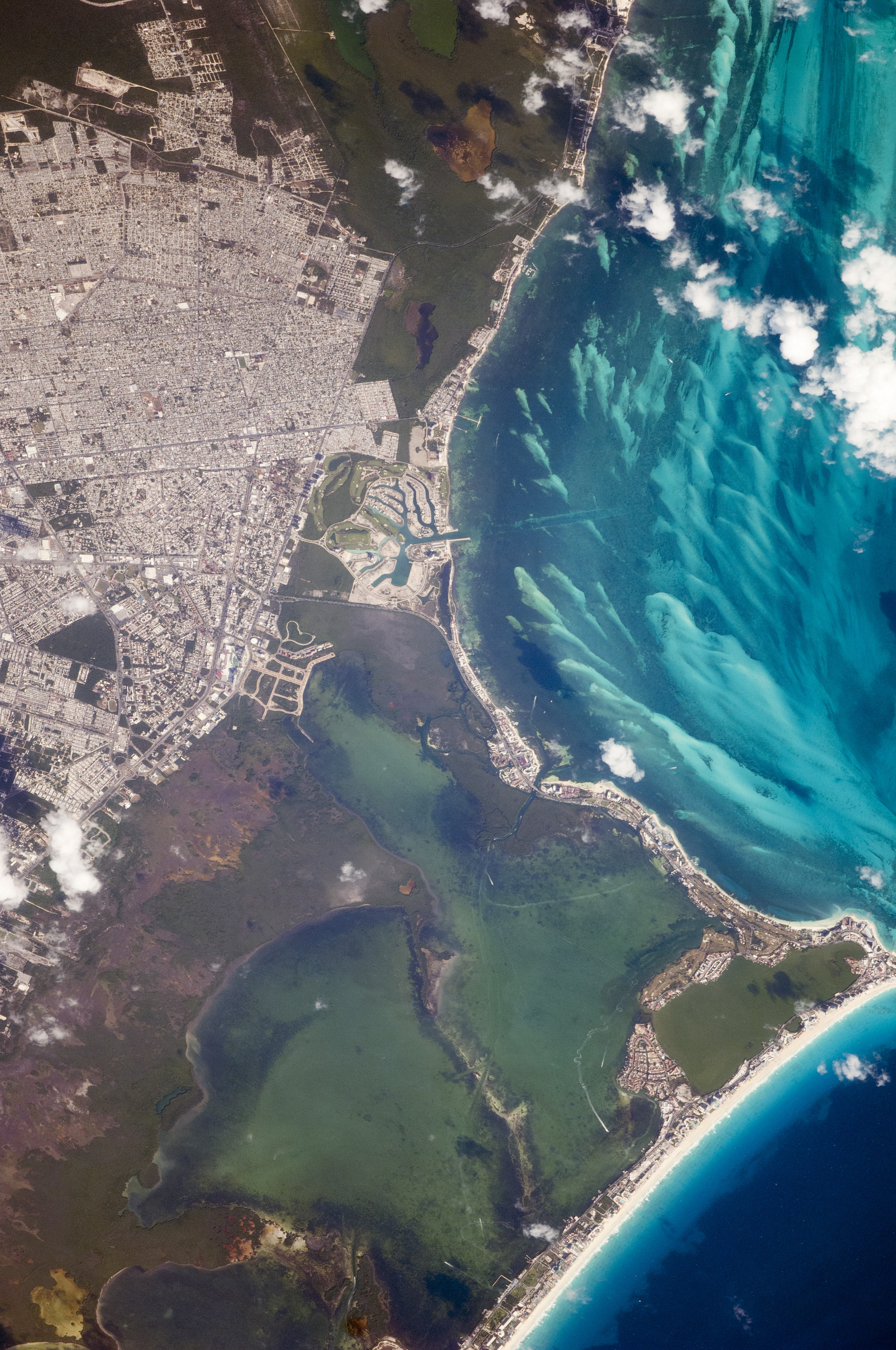 A long lens was used by astronauts aboard the International Space Station to take this photograph highlighting many natural and built features around Cancún. The street pattern of this Mexican tourist mecca contrasts with the waterways of the marinas that open into the bay and the lagoons. And the brilliant blue water over coral reefs contrasts with the dark waters of inland lagoons. The reefs are part of the second largest reef system on Earth, and they draw tourists from all over the world.