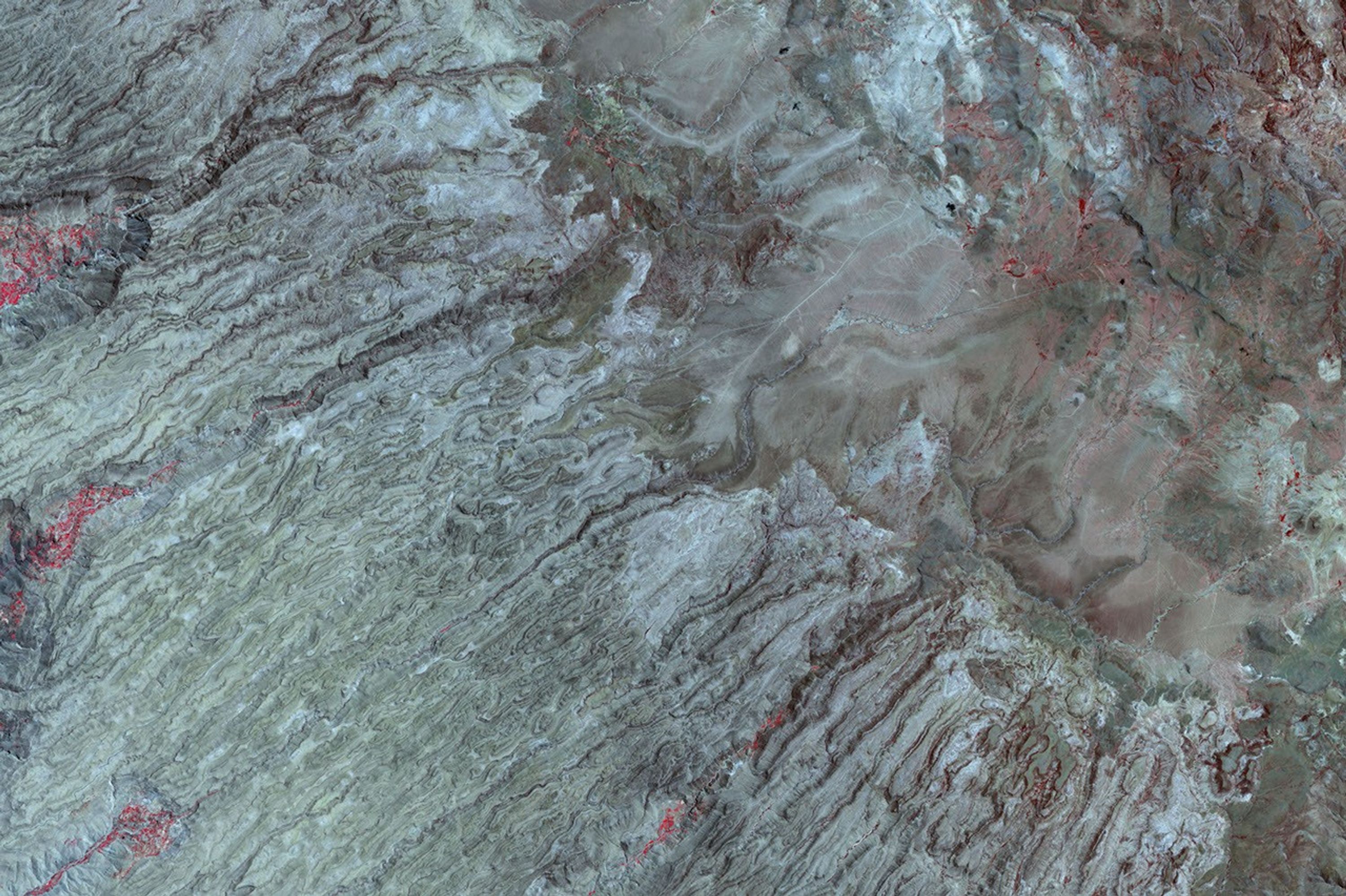The image is made from a combination of visible and infrared light, which makes the lush vegetation hugging the banks of some of the larger rivers stand out in bright red compared to the surrounding rock. In some canyons the vegetation is duller red; this is more likely natural riverside vegetation. The very bright red vegetation, for example, in the largest river canyon, is more likely the result of irrigation. This image was captured on September 28, 2004, by the Advanced Spaceborne Thermal Emission and Reflection Radiometer (ASTER) on NASA’s Terra satellite.