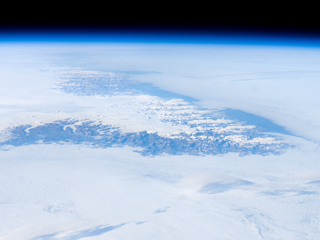The image is highly oblique—taken from an angle looking outwards from the ISS, rather than straight down towards the Earth—and this perspective provides a sense of topography along the southern edge of Greenland. The exposed dark grey bedrock along the southwestern coastline has been carved by glaciers into numerous fjords, steep-sided valleys that drain directly into the ocean. The white cloud cover surrounding the island likely mingles with some sea ice and icebergs calved from glaciers. A band of high-altitude cirrus clouds (light grey) casts shadows on the lower stratus cloud deck in the lower third of the image. The thin blue layer of Earth’s atmosphere is visible spanning the top third of the image from left to right.