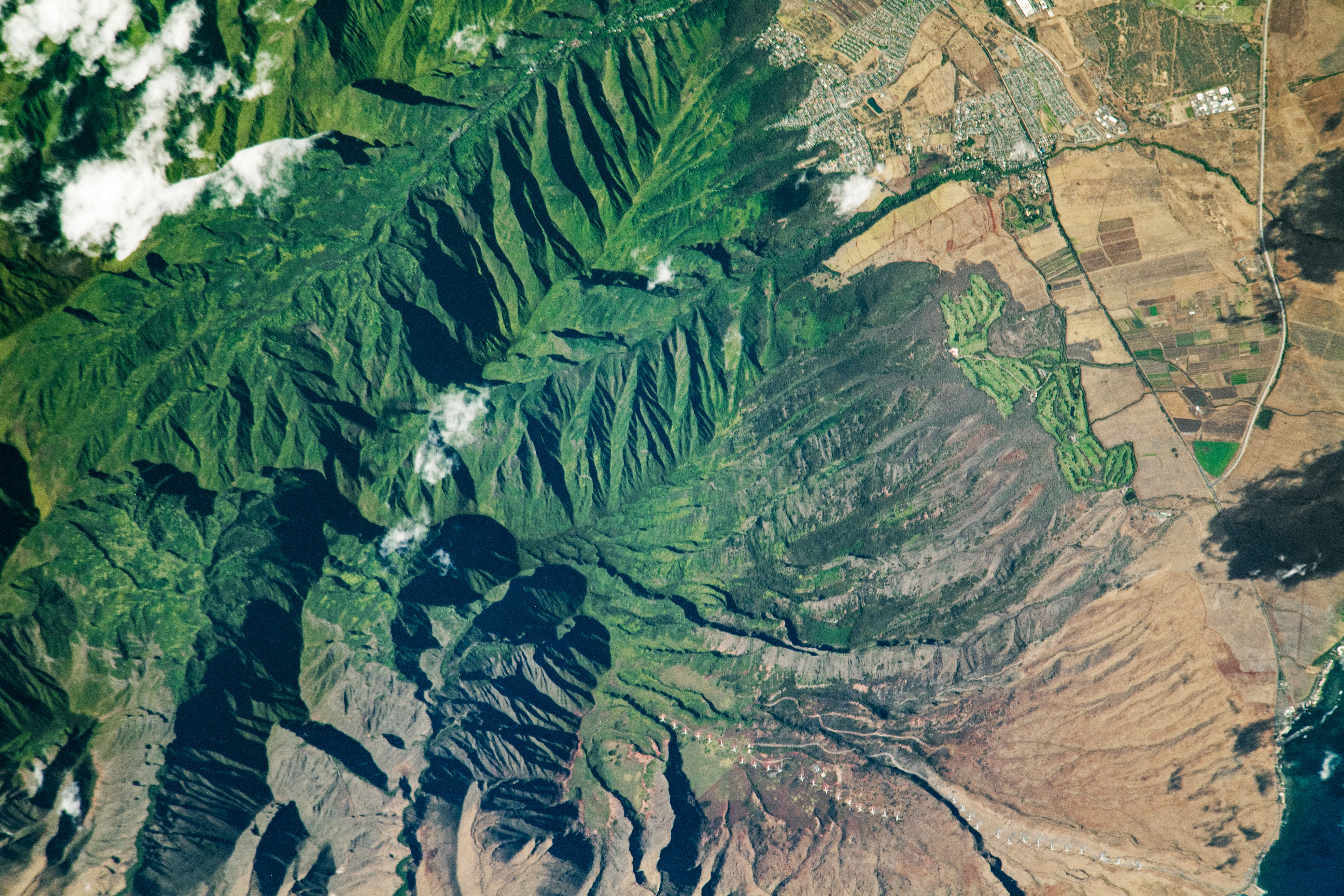 Maui, the second largest island within the Hawaiian Island/Emperor Seamount Chain, hosts one of the largest wind farms in the state. All 34 operational wind turbines of the Kaheawa Wind Power I and II facilities are visible in this photograph taken by an astronaut from the International Space Station (ISS). The wind farm lies to the south of a golf course, agricultural fields, and the small town of Waikapu. All stand at the foot of Pu’u Kukui, a large mountain peak in the Mauna Kahalawai (West Maui Mountains) that is dense with vegetation.