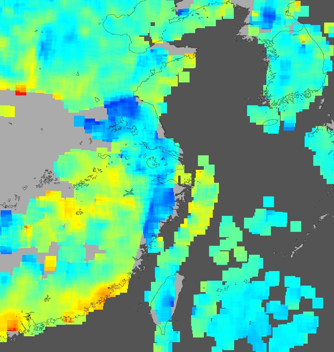 This false-color image shows concentrations of carbon monoxide at an altitude of roughly 18,000 feet (500 millibars) in the atmosphere over eastern China. This image represents a composite of data collected over a three-day period, from January 1-3, 2003, by the Measurements Of Pollution In The Troposphere (MOPITT) instrument aboard NASA’s Terra satellite. The colors represent the mixing ratios of carbon monoxide in the air, given in parts per billion by volume. In this scene, values range from as high as 205 ppbv (red pixels) to as low as 50 ppbv (blue pixels). The grey areas show where no data were collected, either due to persistent cloud cover or gaps between viewing swaths. (Light gray shows land masses and dark gray shows the Pacific Ocean.)