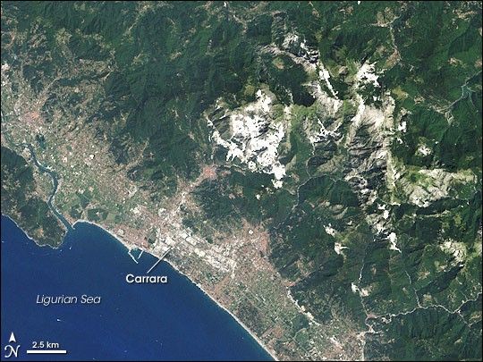 On August 1, 2001, NASA’s Landsat 7 Enhanced Thematic Mapper Plus sensor acquired this natural-color image of Carrara and the surrounding region. Straight lines and sharp angles distinguish urban areas from the wilder landscape of the mountains to the east, both sporting their share of marble. What might look like snow cover on the rugged mountains is actually bright white marble, contrasting with Tuscany’s lush green vegetation in this summertime shot.