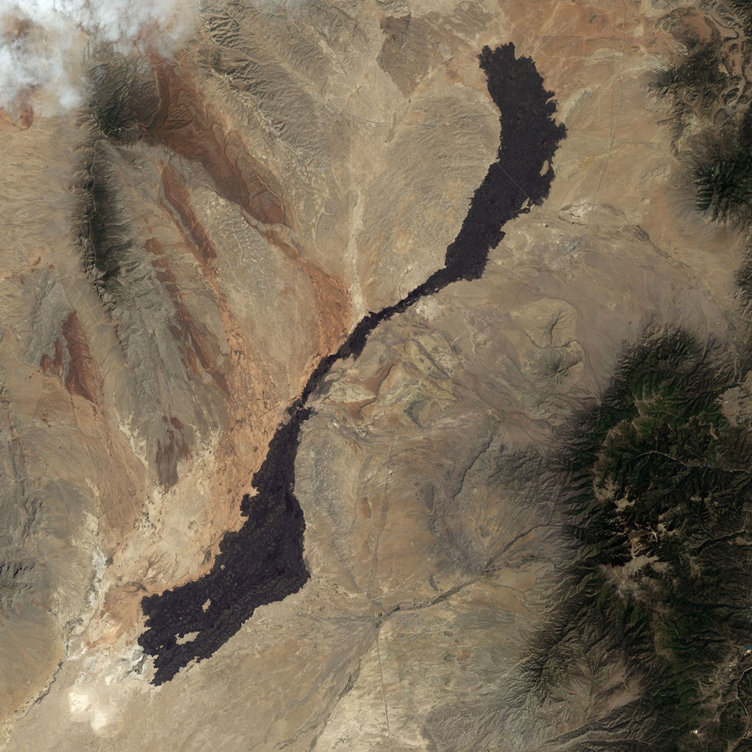 The enhanced Thematic Mapper on NASA’s Landsat 7 satellite captured this photo-like image of Carrizozo Malpais on May 18, 2003. The flow varies in width from 1 kilometer (0.6 miles) along its slender neck to 5 kilometers (3 miles) at either end. Within its curving borders, the Carrizozo lava flow has a uniform dark color, thanks to its basalt content. Basalt tends to flow easily, and this lava flow is described as a pahoehoe flow—advancing through lobes or toes that separate from a cooled crust. The high point on Carrizozo is Little Black Peak. This is a cinder cone—a simple type of volcano made from congealed droplets and blobs of lava that erupted from a single vent.