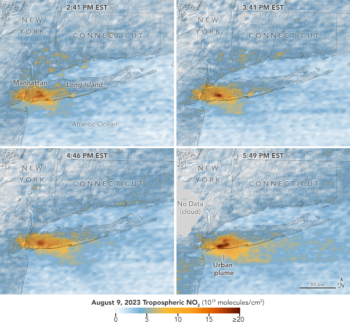 The sequence of images above shows a plume of nitrogen dioxide (NO2) emerging from New York City around noon local time on August 9, 2023. The reddish-brown gas, primarily a byproduct of fossil fuel combustion, is considered hazardous to human health. It also contributes to the formation of ground-level ozone and particulate matter, which are also health hazards.