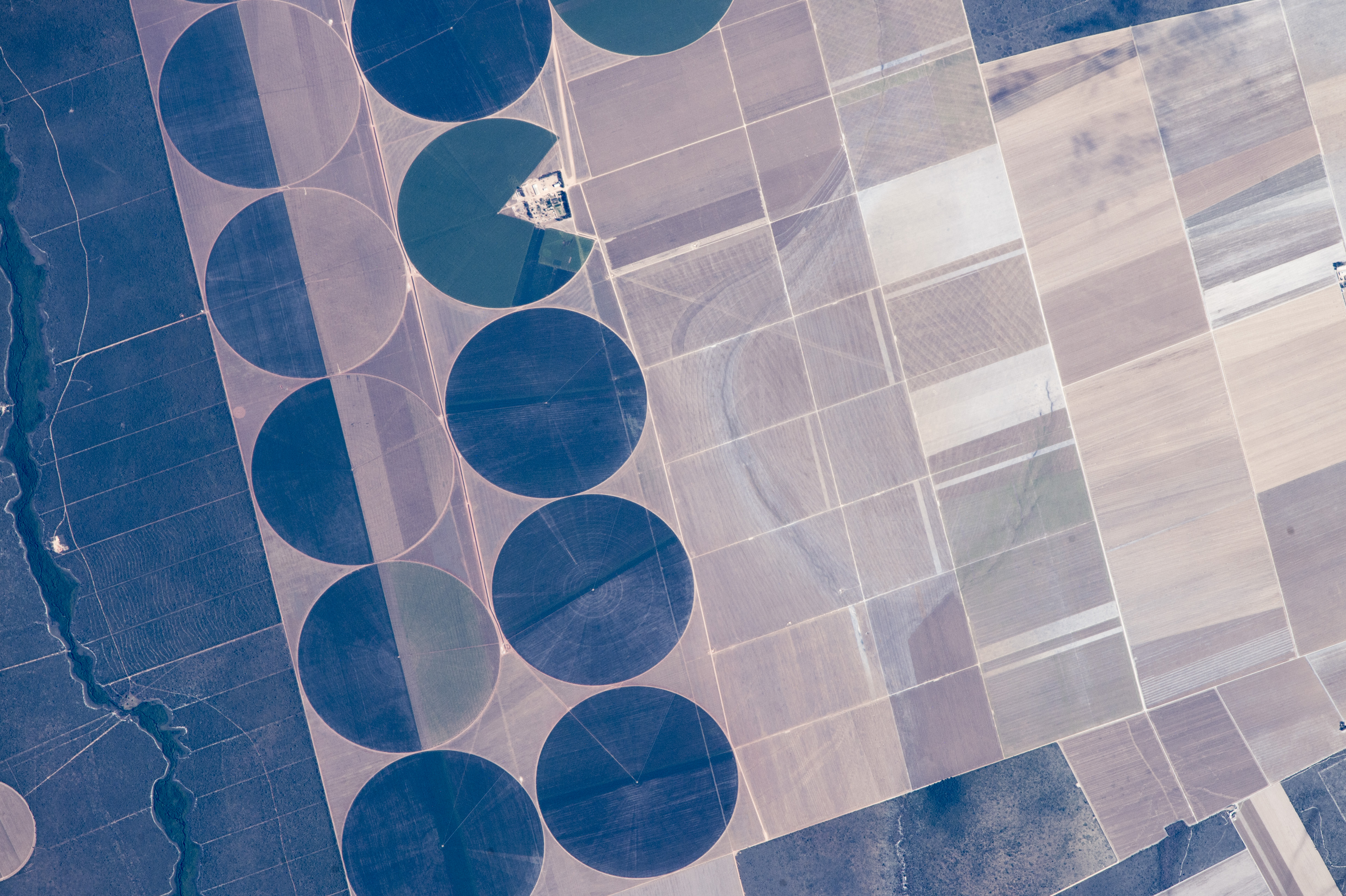 In 2013, this part of Bahia State in Brazil included just a single center-pivot irrigation circle. In this photograph taken in 2015 by an astronaut on the space station, new circles—each about 2 kilometers (1.2 miles) in diameter—are tightly packed and overlaid on the original rectangular farm grid. Like a Pac-Man, one circle appears to be swallowing a farm house. The ragged lines of a forested stream (left) contrast with the sweeping, ghostly shapes of plowed stream beds (image center).