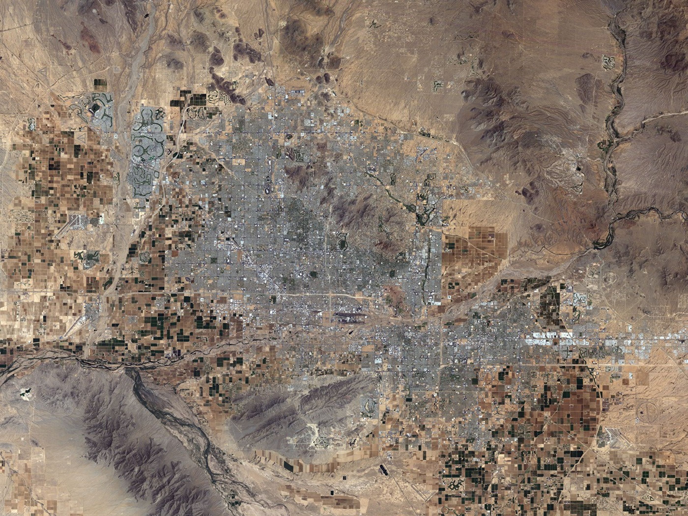 The Phoenix, Arizona, metropolitan area is the largest in the southwestern United States. The city is made up of 21 contiguous (connected through an unbroken sequence) incorporated municipalities. When discrete political entities form a larger, integrated urban landscape, geographers call the arrangement a conurbation. This astronaut photograph (upper image) of the central metro region includes the boundary area between three of the municipalities included in the conurbation: the cities of Phoenix (left), Tempe (center and lower right), and Scottsdale (upper right). This high-resolution astronaut image has a spatial resolution (level of detail) of about 9 meters per image pixel. A regional view of the greater Phoenix metropolitan area is also available from the Earth Observatory.