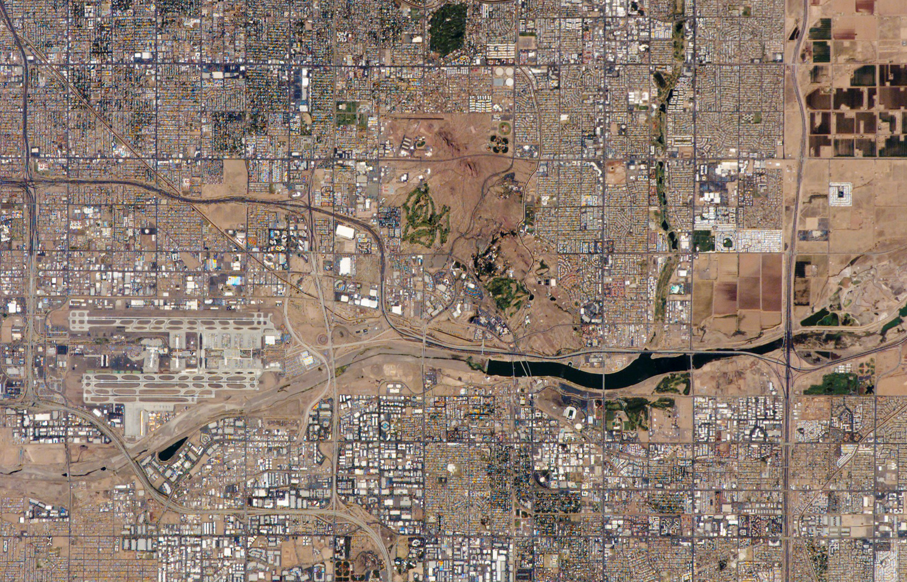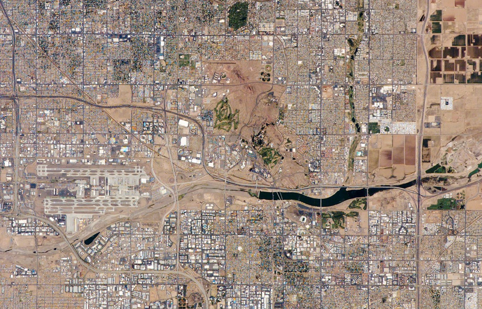 The Phoenix, Arizona, metropolitan area is the largest in the southwestern United States. The city is made up of 21 contiguous (connected through an unbroken sequence) incorporated municipalities. When discrete political entities form a larger, integrated urban landscape, geographers call the arrangement a conurbation. This astronaut photograph (upper image) of the central metro region includes the boundary area between three of the municipalities included in the conurbation: the cities of Phoenix (left), Tempe (center and lower right), and Scottsdale (upper right). This high-resolution astronaut image has a spatial resolution (level of detail) of about 9 meters per image pixel. A regional view of the greater Phoenix metropolitan area is also available from the Earth Observatory.