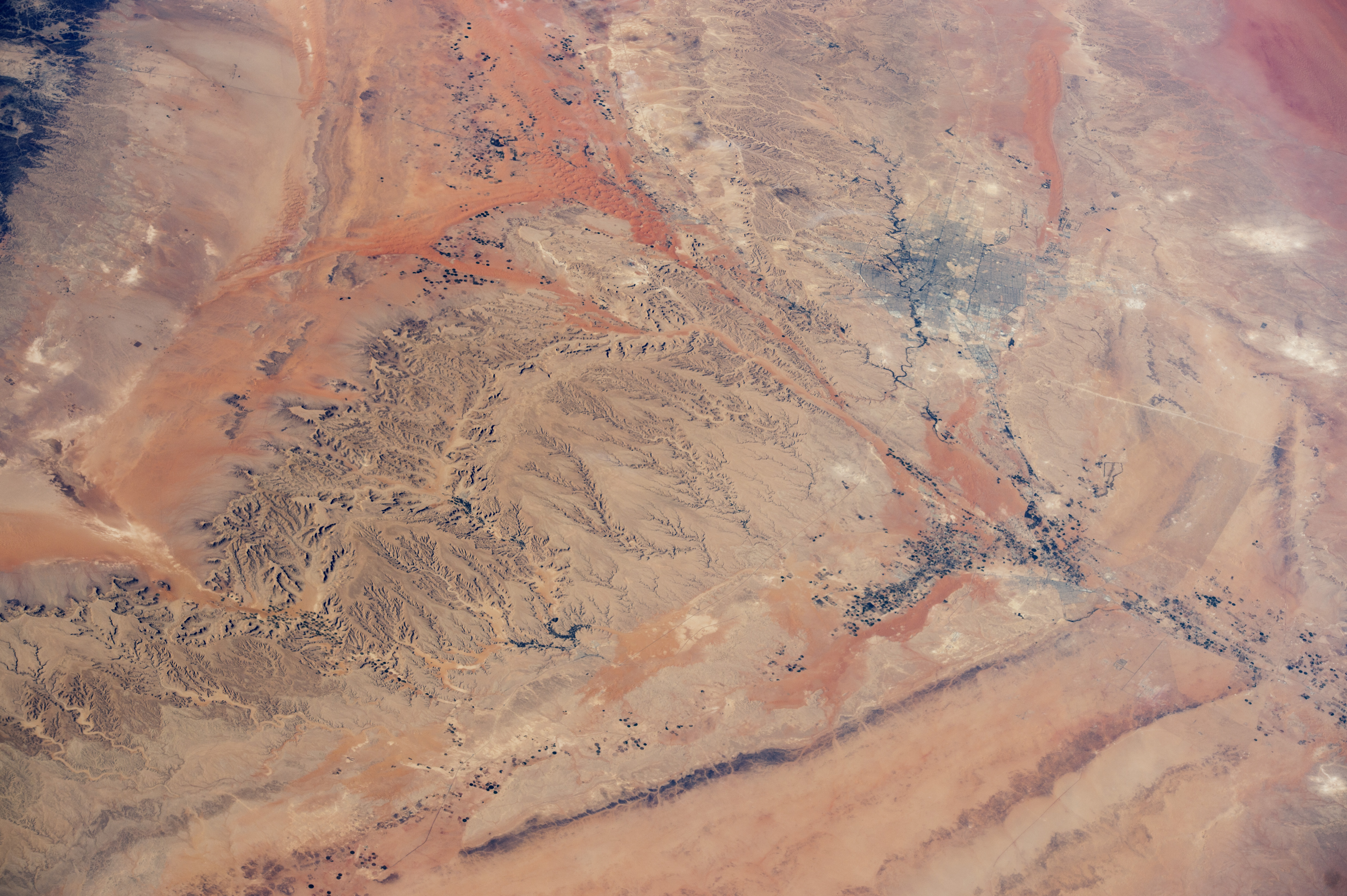 Astronauts aboard the International Space Station took this photograph when the desert center of Arabia was partly obscured by a dusty atmosphere. With slight image enhancement, a wealth of detail appears—most strikingly, the swaths of red dunes, the straight lines of rock ridges, and the city of Riyadh (capital of Saudi Arabia).