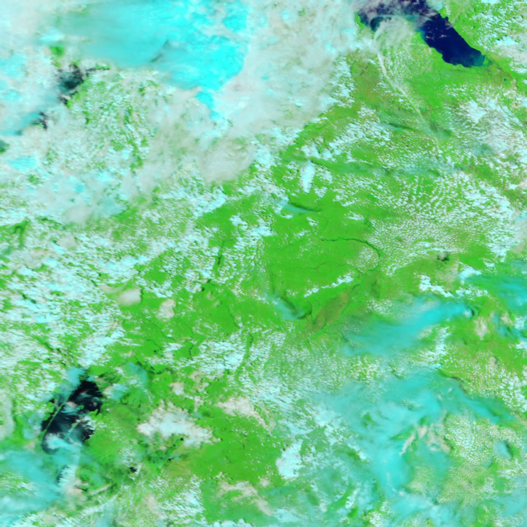 The large images provided above are at MODIS’ full resolution of 250 meters per pixel. Both false-color and photo-like, true-color images of Zambia are available from the MODIS Rapid Response System in a variety of resolutions on a daily basis.