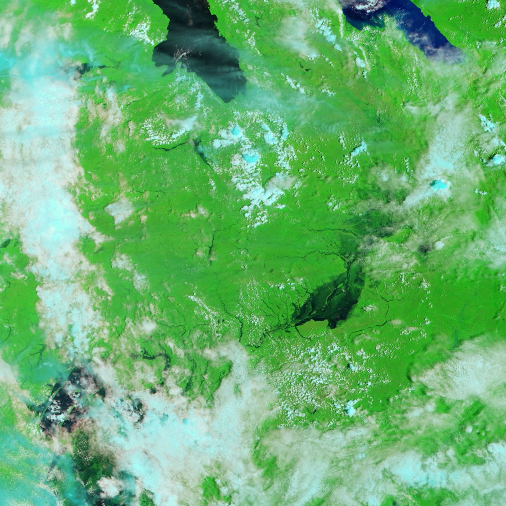 Taken a little more than a month apart, this pair of images illustrates the severity of the flooding in East Zambia. The images were made with a combination of visible and infrared light to increase the contrast between water and land. In this type of false-color image, water is black, plant-covered land is green, and bare ground is a rosy tan. Clouds are pale blue and white. The tan land around the Chambeshi River in the lower image may illustrate the typical extent of the river during the rainy season. Clearly, the river has expanded beyond the patch of plant-free ground.